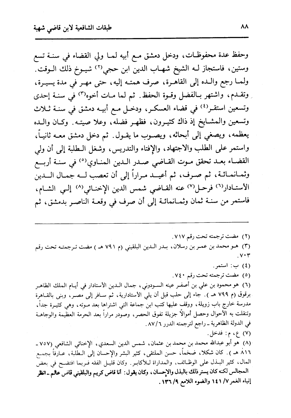 وَحفظ عدَّة محفوظات وَدخل دمشق مَعَ أَبِيه لما ولي الْقَضَاء فِي سنة تسع وَسِتِّينَ فاستجاز لَهُ الشَّيْخ شهَاب الدَّين ابْن حجي شُيُوخ ذَلِك الْوَقْت وَلما رَجَعَ وَالِده إِلَى الْقَاهِرَة صرف همته إِلَيْهِ حَتَّى مهر فِي مُدَّة يسيرَة وَتقدم واشتهر بِالْفَضْلِ وَقُوَّة الْحِفْظ ثمَّ لما مَاتَ أَخُوهُ فِي سنة إِحْدَى وَتِسْعين اسْتَقر فِي قَضَاء الْعَسْكَر وَدخل مَعَ أَبِيه دمشق فِي سنة ثَلَاث وَتِسْعين والمشايخ إِذْ ذَاك كَثِيرُونَ فَظهر فَضله وَعلا صيته وَكَانَ وَالِده يعظمه ويصفي إِلَى أبحاثه ويصوب مَا يَقُول ثمَّ دخل دمشق مَعَه ثَانِيًا وَاسْتمرّ على الطّلب وَالِاجْتِهَاد والإفتاء والتدريس وشغل الطّلبَة إِلَى أَن ولي الْقَضَاء بعد تحقق موت القَاضِي صدر الدَّين الْمَنَاوِيّ فِي سنة أَربع وَثَمَانمِائَة ثمَّ صرف ثمَّ أُعِيد مرَارًا إِلَى أَن تعصب لَهُ جمال الدَّين الأستادار فَرَحل عَنهُ القَاضِي شمس الدَّين الإخنائي إِلَيّ الشَّام فاستمر من سنة ثَمَان وَثَمَانمِائَة إِلَى أَن صرف فِي وقْعَة النَّاصِر بِدِمَشْق ثمَّ