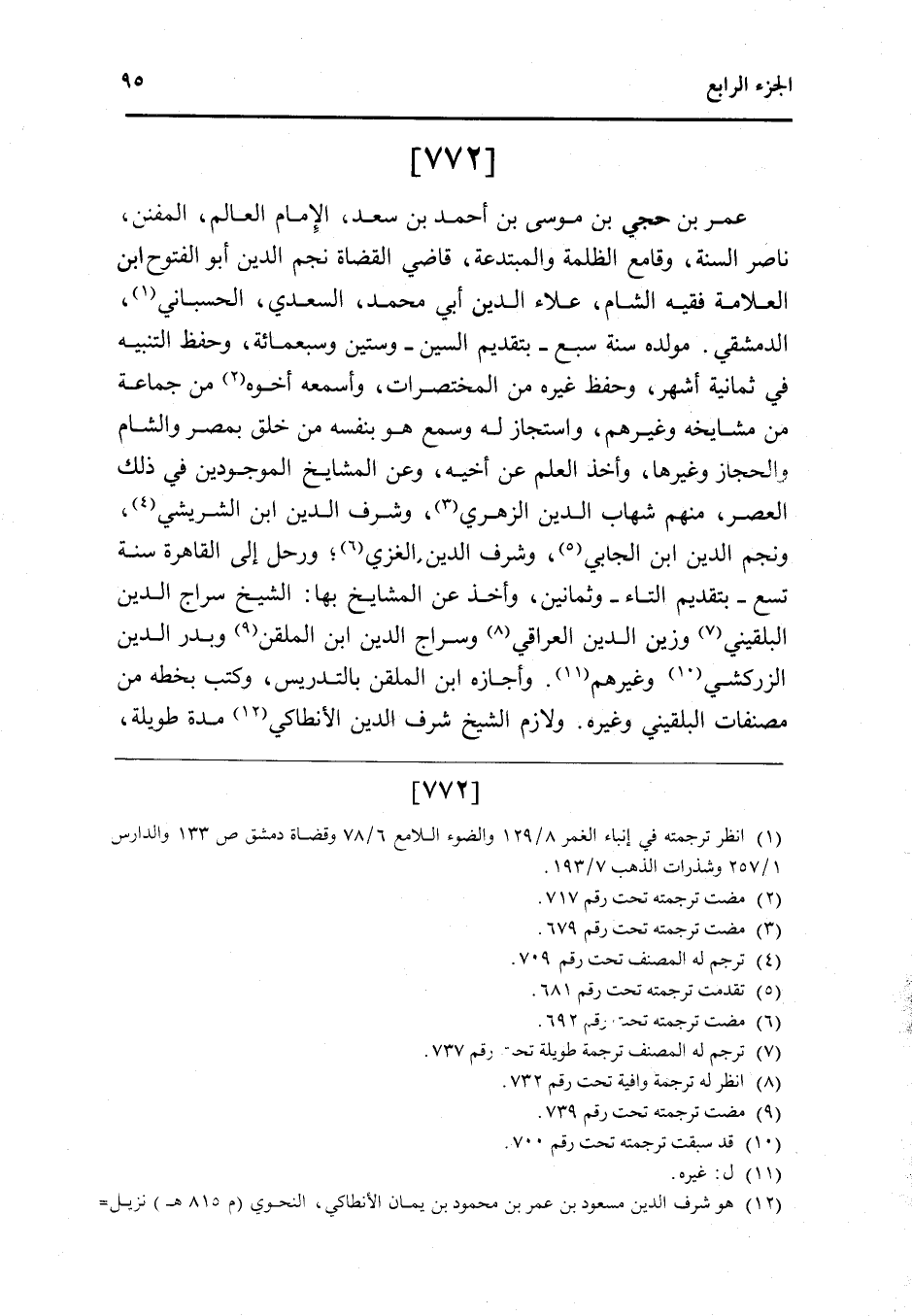 772 - عمر بن حجي بن مُوسَى بن أَحْمد بن سعد الإِمَام الْعَالم المفنن نَاصِر السّنة وقامع الظلمَة والمبتدعة قَاضِي الْقُضَاة نجم الدَّين أَبُو الْفتُوح ابْن الْعَلامَة فَقِيه الشَّام عَلَاء الدَّين أبي مُحَمَّد السَّعْدِيّ الحسباني الدِّمَشْقِي مولده سنة سبع بِتَقْدِيم السِّين وَسِتِّينَ وَسَبْعمائة وَحفظ التَّنْبِيه فِي ثَمَانِيَة أشهر وَحفظ غَيره من المختصرات وأسمعه أَخُوهُ من جمَاعَة من مشايخه وَغَيرهم واستجاز لَهُ وَسمع هُوَ بِنَفسِهِ من خلق بِمصْر وَالشَّام والحجاز وَغَيرهَا وَأخذ الْعلم عَن أَخِيه وَعَن الْمَشَايِخ الْمَوْجُودين فِي ذَلِك الْعَصْر مِنْهُم شهَاب الدَّين الزُّهْرِيّ وَشرف الدَّين ابْن الشريشي وَنجم الدَّين ابْن الجابي وَشرف الدَّين الْغَزِّي ورحل إِلَى الْقَاهِرَة سنة تسع بِتَقْدِيم التَّاء وَثَمَانِينَ وَأخذ عَن الْمَشَايِخ بهَا الشَّيْخ سراج الدَّين البُلْقِينِيّ وزين الدَّين الْعِرَاقِيّ وسراج الدَّين ابْن الملقن وَبدر الدَّين الزَّرْكَشِيّ وَغَيرهم وَأَجَازَهُ ابْن الملقن بالتدريس وَكتب بِخَطِّهِ من مصنفات البُلْقِينِيّ وَغَيره ولازم الشَّيْخ شرف الدَّين الْأَنْطَاكِي مُدَّة طَوِيلَة