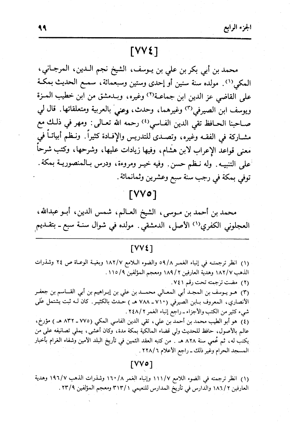 774 - مُحَمَّد بن أبي بكر بن عَليّ بن يُوسُف الشَّيْخ نجم الدَّين الْمرْجَانِي الْمَكِّيّ مولده سنه سِتِّينَ أَو إِحْدَى وَسِتِّينَ وَسَبْعمائة سمع الحَدِيث بِمَكَّة على القَاضِي عز الدَّين ابْن جمَاعَة وَغَيره وبدمشق من ابْن خطيب المزة ويوسف ابْن الصَّيْرَفِي وَغَيرهمَا وَحدث وعني بِالْعَرَبِيَّةِ ومتعلقاتها قَالَ لي صاحبنا الْحَافِظ تَقِيّ الدَّين الفاسي رَحمَه الله تَعَالَى وَمهر فِي ذَلِك مَعَ مُشَاركَة فِي الْفِقْه وَغَيره وتصدى للتدريس والإفادة كثيرا ونظم أبياتا فِي معنى قَوَاعِد الْإِعْرَاب لِابْنِ هِشَام وفيهَا زيادات عَلَيْهَا وَشَرحهَا وَكتب شرحا على التَّنْبِيه وَله نظم حسن وَفِيه خير ومروءة ودرس بالمنصورية بِمَكَّة توفّي بِمَكَّة فِي رَجَب سنة سبع وَعشْرين وَثَمَانمِائَة