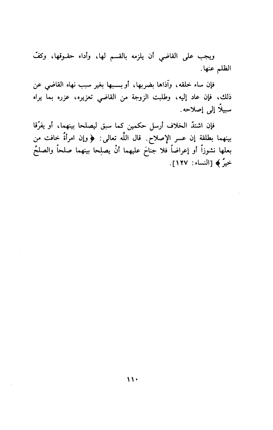 فإن اشتد الخلاف أرسل حكمين كما سبق ليصلحا بينهما، أو يفرقا بينهما بطلقة إن عسر الإصلاح. قال الله تعالى: {وَإِنِ امْرَأَةٌ خَافَتْ مِن بَعْلِهَا نُشُوزاً أَوْ إِعْرَاضاً فَلاَ جُنَاْحَ عَلَيْهِمَا أَن يُصْلِحَا بَيْنَهُمَا صُلْحاً وَالصُّلْحُ خَيْرٌ} [النساء: 127].