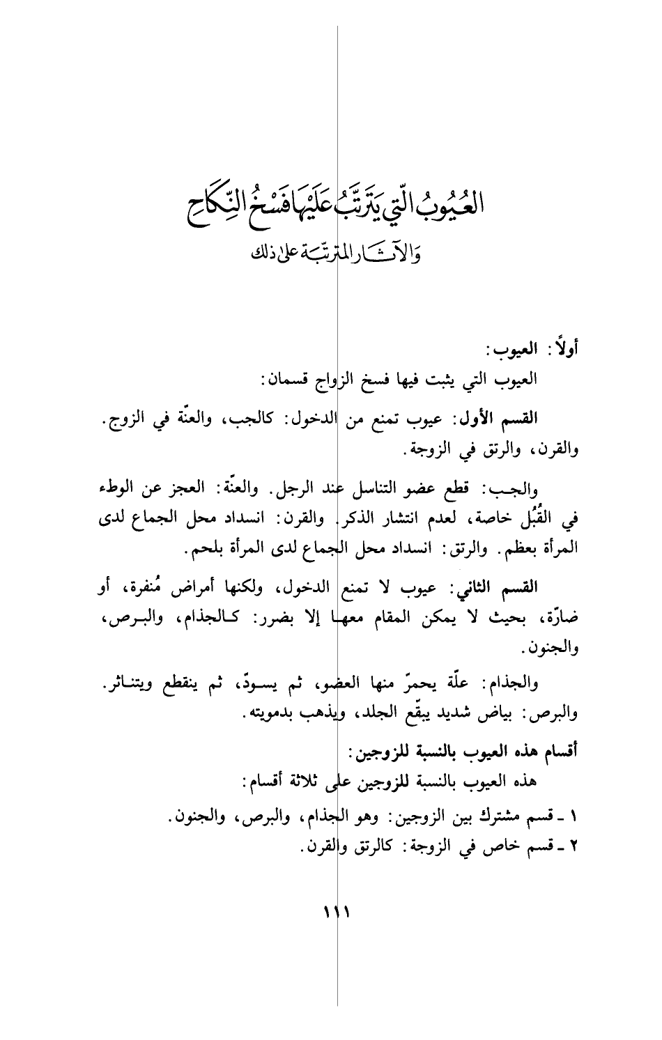 القسم الأول: عيوب تمنع من الدخول: كالجب، والعنّة في الزواج. والقرن، والرتق في الزوجة.