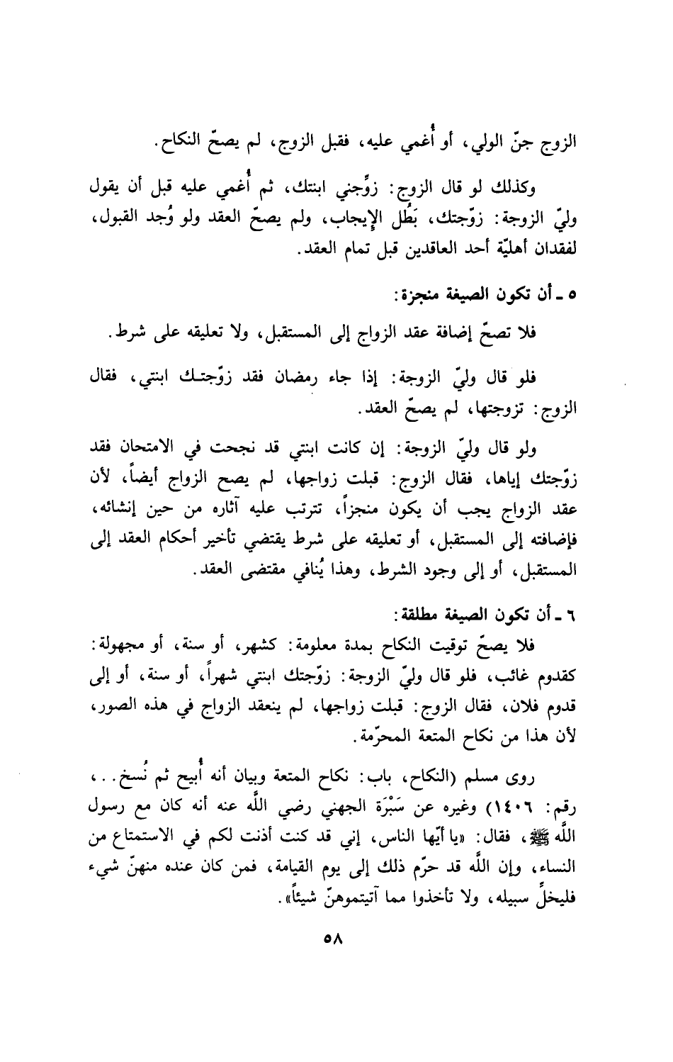 فلا يصحّ توقيت النكاح بمدة معلومة: كشهر، أو سنة، أو مجهولة: كقدوم غائب، فلو قال وليّ الزوجة: زوّجتك ابنتي شهراً، أو سنة، أو إلى قدوم فلان، فقال الزوج: قبلت زواجها، لم ينعقد الزواج في هذه الصور، لأن هذا من نكاح المتعة المحرّمة.