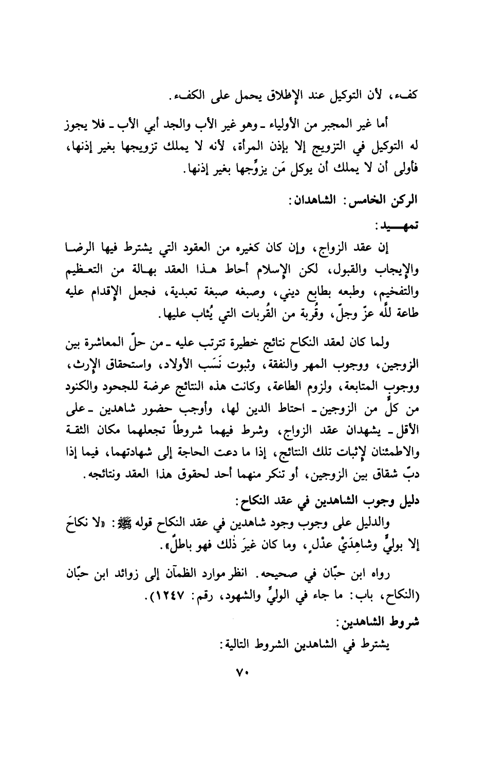 ولما كان لعقد النكاح نتائج خطيرة تترتب عليه ـ من حل المعاشرة بين الزوجين، ووجوب المهر والنفقة، وثبوت نسب الأولاد، واستحقاق الإرث، ووجوب المتابعة، ولزوم الطاعة، وكانت هذه النتائج عرضة للجحود والكنود من كل من الزوجين ـ احتاط الدين لها، وأوجب حضور شاهدين ـ على الأقل ـ يشهدان عقد الزواج، وشرط فيهما شروطاً تجعلهما مكان الثقة والاطمئنان لإثبات تلك النتائج، إذا ما دعت الحاجة إلى شهادتهما، فيما إذا دبّ شقاق بين الزوجين، أو تنكر منهما أحد لحقوق هذا العقد ونتائجه.