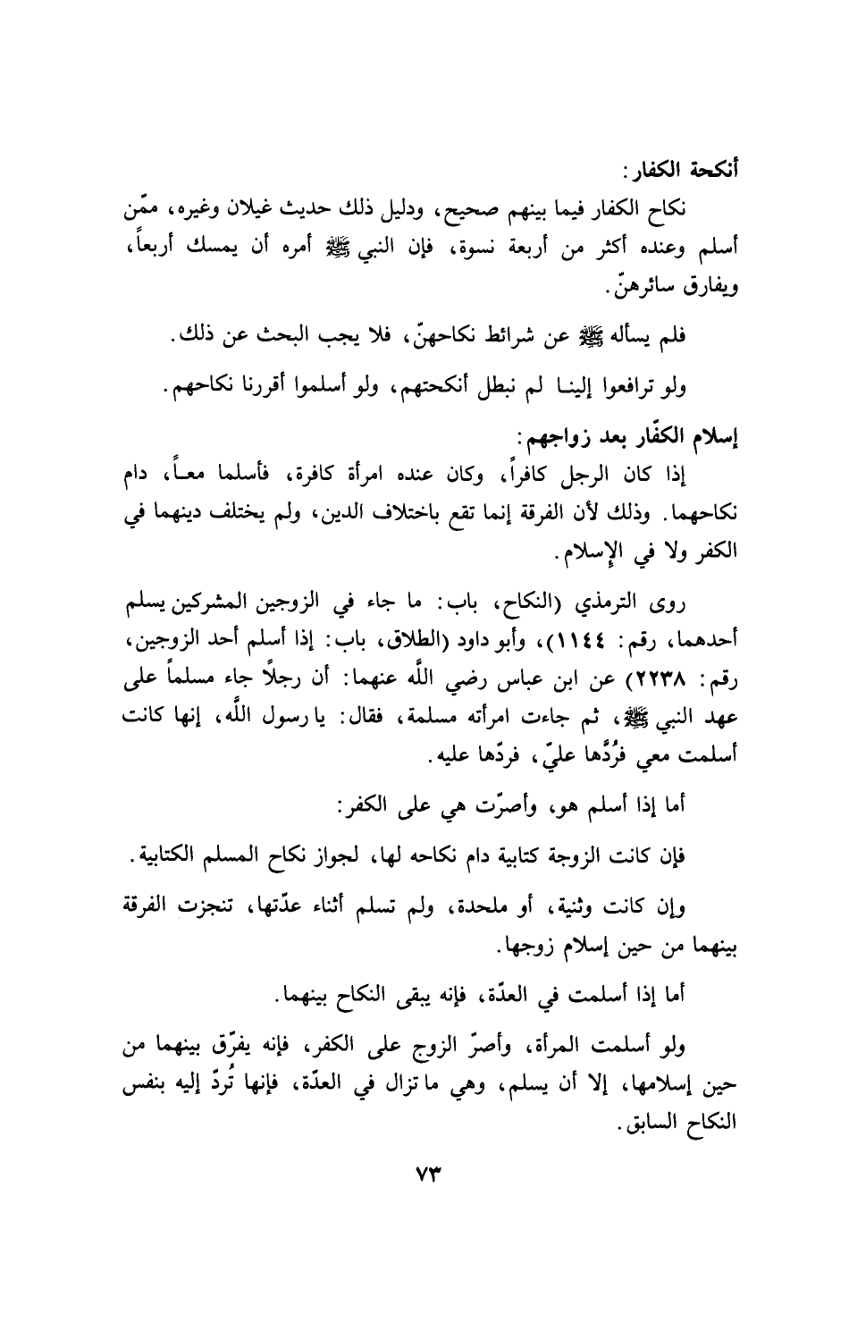 روى الترمذي (النكاح، باب: ما جاء في الزوجين المشركين يسلم أحدهما، رقم: 1144)، وأبو داود (الطلاق، باب: إذا أسلم أحد الزوجين، رقم: 2283) عن ابن عباس رضي الله عنهما: أن رجلاً جاء مسلماً على عهد النبي - صلى الله عليه وسلم -، ثم جاءت امرأته مسلمة، فقال: يا رسول الله، إنها كانت أسلمت معي فرُدَّها عليّ، فردها عليه.