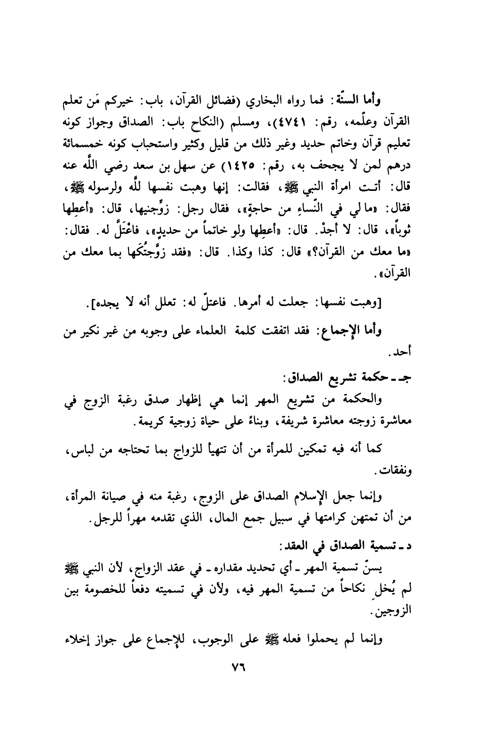 وأما السنّة: فما رواه البخاري (فضائل القرآن، باب: خيركم مَن تعلم القرآن وعلمه، رقم: 4741)، ومسلم (النكاح، باب: الصداق وجواز كونه تعليم قرآن وخاتم حديد وغير ذلك من قليل وكثير واستحباب كونه خمسمائة درهم لمن لا يجحف به، رقم: 1425) عن سهل بن سعد - رضي الله عنه - قالت: " ما لي في النساء من حاجة " فقال رجل: زوِّجنيها، قال: " أعطها ثوباً " قال: لا أجدْ. قال: " أعطها ولو خاتماً من حديد "، فاعْتَلَّ له. فقال: " ما معك من القرآن؟ " قال: كذا وكذا. قال: " فقد زوَّجتُكَها بما معك من القرآن. "