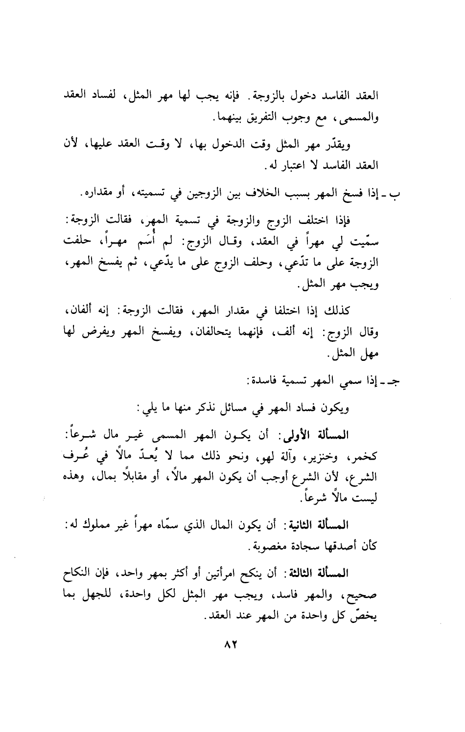 المسألة الأولى: أن يكون المهر المسمى غير مال شرعاً: كخمر، وخنزير، وآلة لهو، ونحو ذلك مما لا يُعدّ مالاً في عُرف الشرع، لأن الشرع أوجب أن يكون المهر مالاً، أو مقابلاً بمال، وهذه ليست مالاً شرعاً.