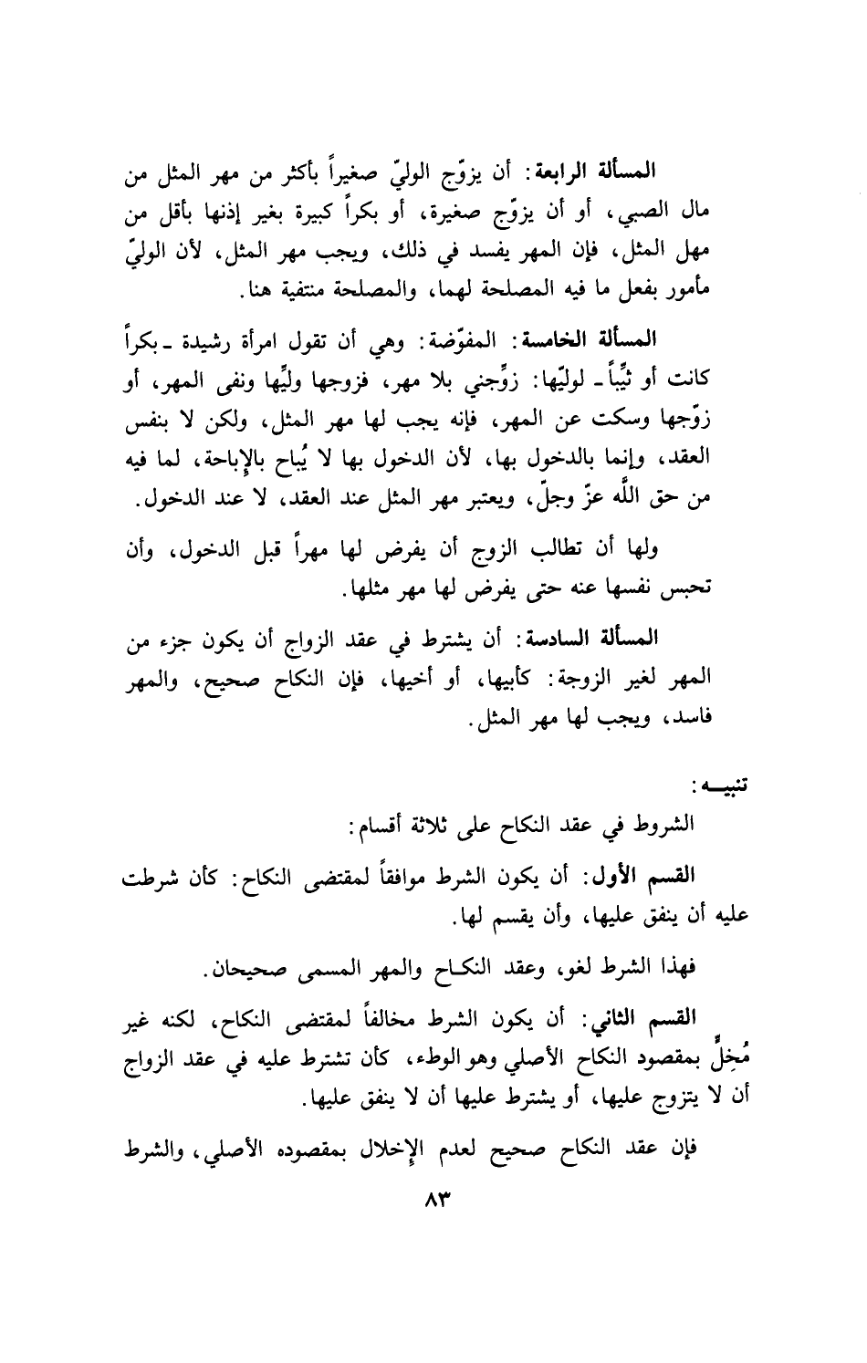 المسألة الخامسة: المفّوضة: وهي أن تقول امرأة رشيدة ـ بكراً كانت أو ثيباً ـ لوليّها: زوِّجني بلا مهر، فزوجها وليها ونفي المهر، أو زوجها وسكت عن المهر، فإنه يجب لها مهر المثل، ولكن لا بنفس العقد، وإنما بالدخول بها، لأن الدخول بها لا يُباح بالإباحة، لما فيه من حق الله عز وجل، ويعتبر مهر المثل عند العقد، لا عند الدخول.