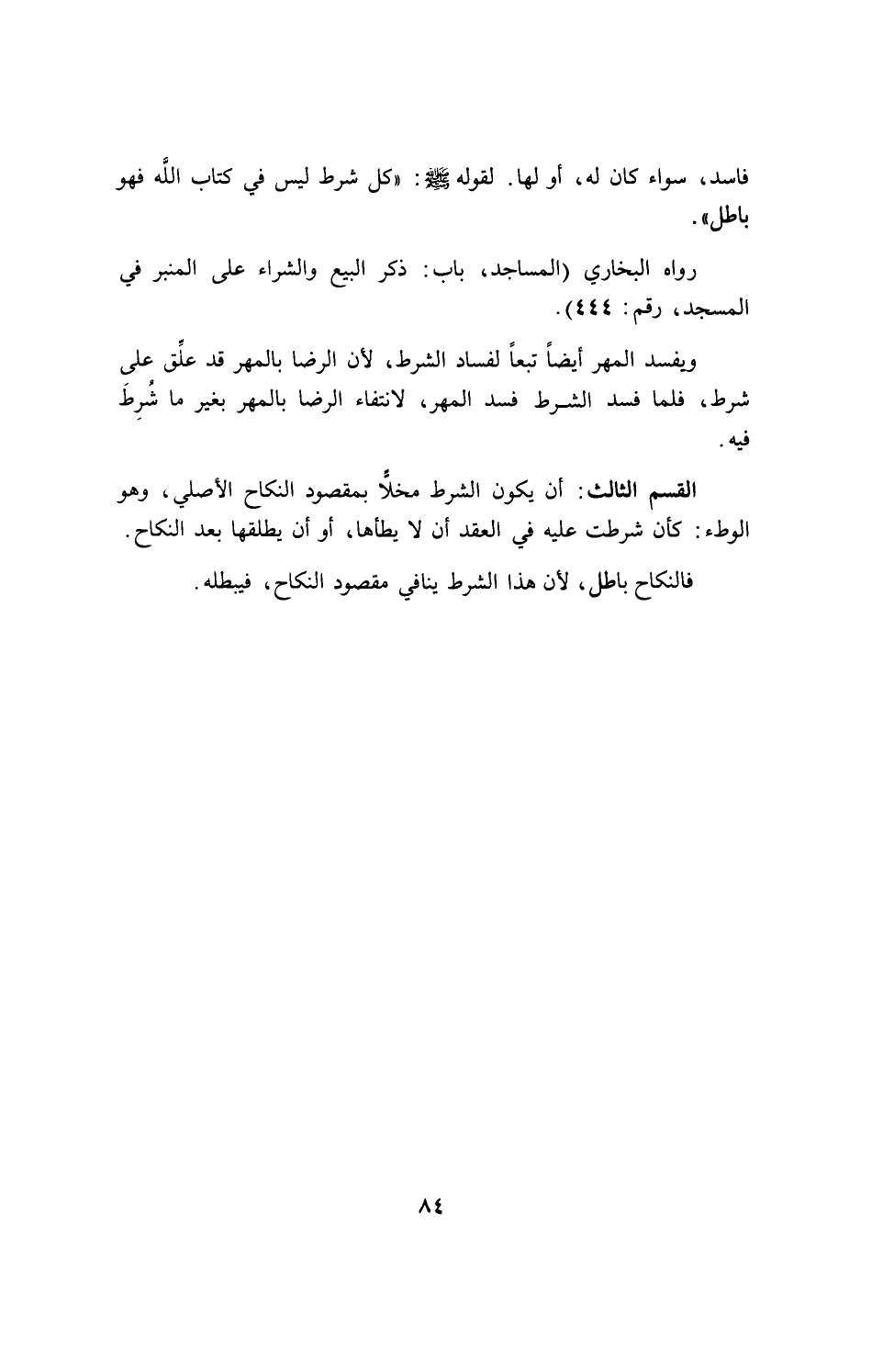 القسم الثالث: أن يكون الشرط مخلاً بمقصود النكاح الأصلي، وهو الوطء: كأن شرطت عليه في العقد أن لا يطأها، أو أن يطلقها بعد النكاح.