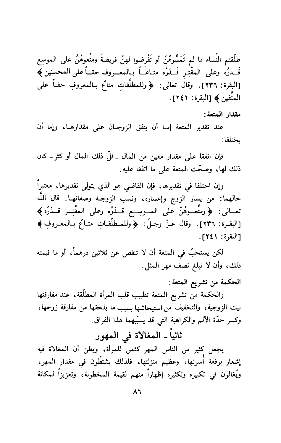 طَلَّقْتُمُ النِّسَاء مَا لَمْ تَمَسُّوهُنُّ أَوْ تَفْرِضُواْ لَهُنَّ فَرِيضَةً وَمَتِّعُوهُنَّ عَلَى الْمُوسِعِ قَدَرُهُ وَعَلَى الْمُقْتِرِ قَدْرُهُ مَتَاعاً بِالْمَعْرُوفِ حَقّاً عَلَى الْمُحْسِنِينَ} [البقرة: 236] وقال تعالى: {وَلِلْمُطَلَّقَاتِ مَتَاعٌ بِالْمَعْرُوفِ حَقّاً عَلَى الْمُتَّقِينَ}