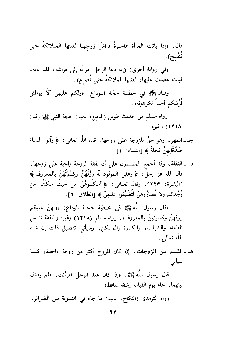 د ـ النفقة، وقد أجمع المسلمون على أن نفقة الزوجة واجبة على زوجها. قال الله عز جل: