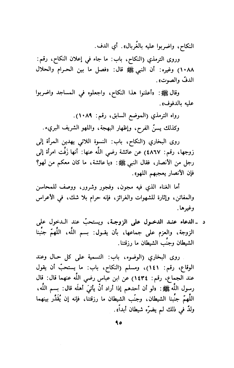 د ـ الدعاء عند الدخول على الزوجة، ويستحب عند الدخول على الزوجة، والعزم على جماعها، بأن يقول: بسم الله، اللهم جنبنا الشيطان وجنب الشيطان ما رزقتنا.