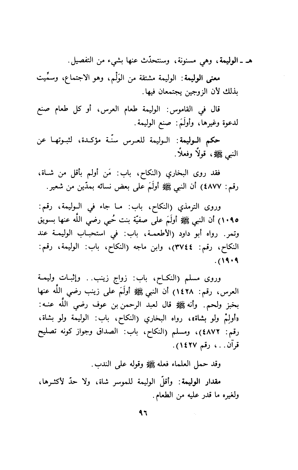 هـ ـ الوليمة، وهي مسنونة، وسنتحدّث عنها بشيء من التفصيل.
