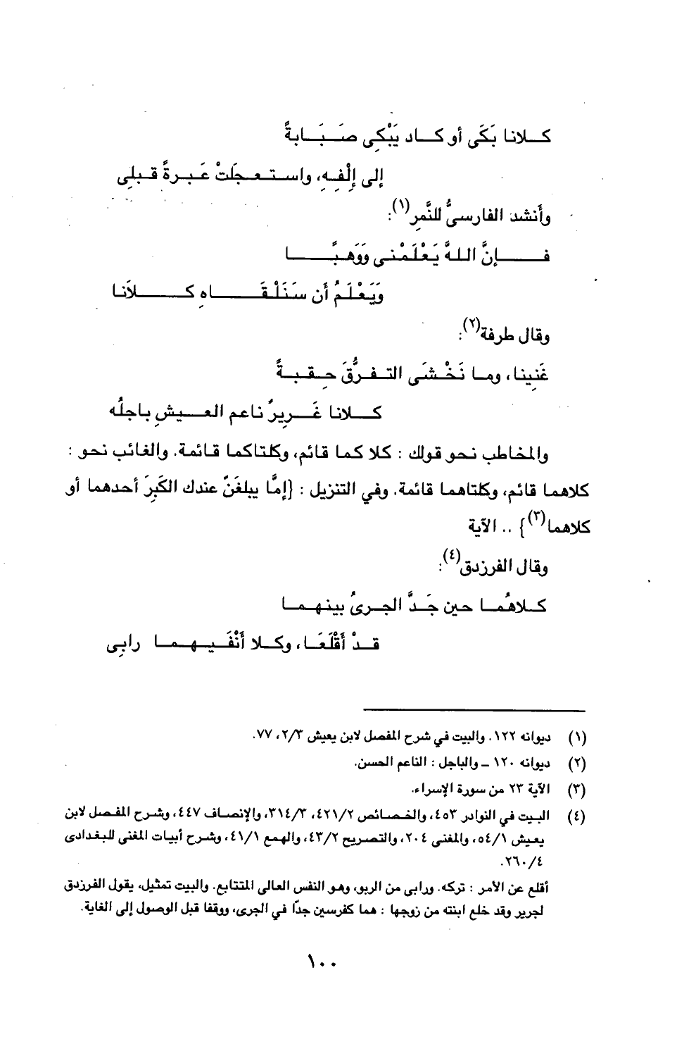 (4) البيت في النوادر 453، والخصائص 2/ 421، 3/ 314، والإنصاف 447، وشرح المفصل لابن يعيش 1/ 54، والمغني 204، والتصريح 2/ 43، والهمع 1/ 41، وشرح أبيات المغني للبغدادي 4/ 260.