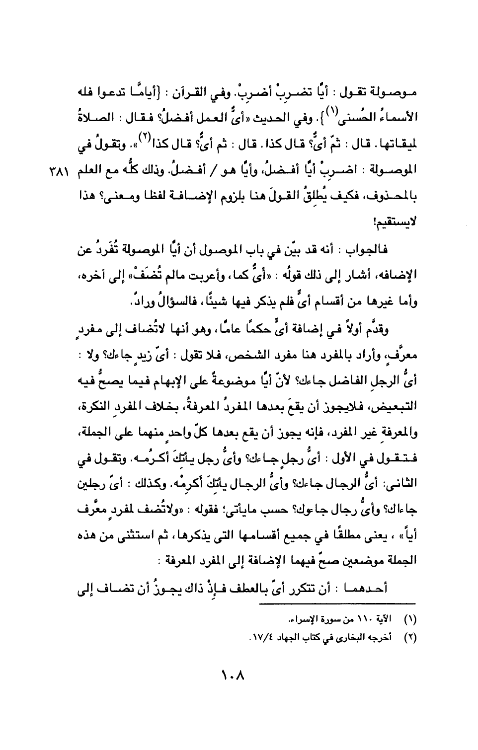 موصولة تقول: أيَّا تضرِبْ أضرِبْ. وفي القرآن: {أيامَّا تدعو فله الأسماءُ الحُسنى (1)}. وفي الحديث ((أيُّ العمل أفضلُ؟ فقال: الصلاةُ لميقاتها. قال: ثمّ أيٌّ؟ قال كذا. قال: ثم أيٌّ؟ قال كذا (2))). وتقول في الموصولة: اضرِبْ أيَّا أفضلُ، وأيَّا هو/ أفضل. وذلك كلُّه مع العلم بالمحذوف، 381 فكيف يُطلقُ القولَ هنا بلزوم الإضافة لفظا ومعنى؟ هذا لا يستقيم!