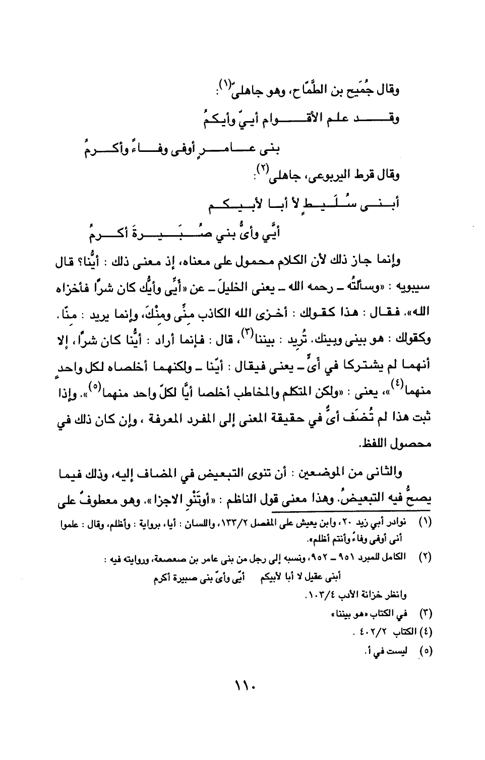 وإنما جاز ذلك لأن الكلام محمول على معناه، إذ معنى ذلك: أيُّنا؟ قال سيبويه: ((وسألتُه-رحمه الله- يعني الخليلَ- عن ((أِسِّي وأيُّك كان شرا فأخزاه الله)). فقال: هذا كقولك: أخزى الله الكاذب مِنِّي ومِنْكَ، وإنما يريد: مِنّا. وكقولك: هو بيني وبينك. تُريد: بيننا (3)، قال: فإنما أراد: أيُّنا كان شراً، إلا أنهما لم يشتركا في أَيٍّ- يعني فيقال: أيّنا- ولكنهما أخلصاه لكل واحدٍ منهما (4)))، يعني: ((ولكن المتكلم والمخاطب أخلصا أيَّا لكلّ واحد منهما (5))). وإذا ثبت هذا لم تُضَف أيُّ في حقيقة المعنى إلى المفرد المعرفة، وإن كان ذلك في محصول اللفظ.