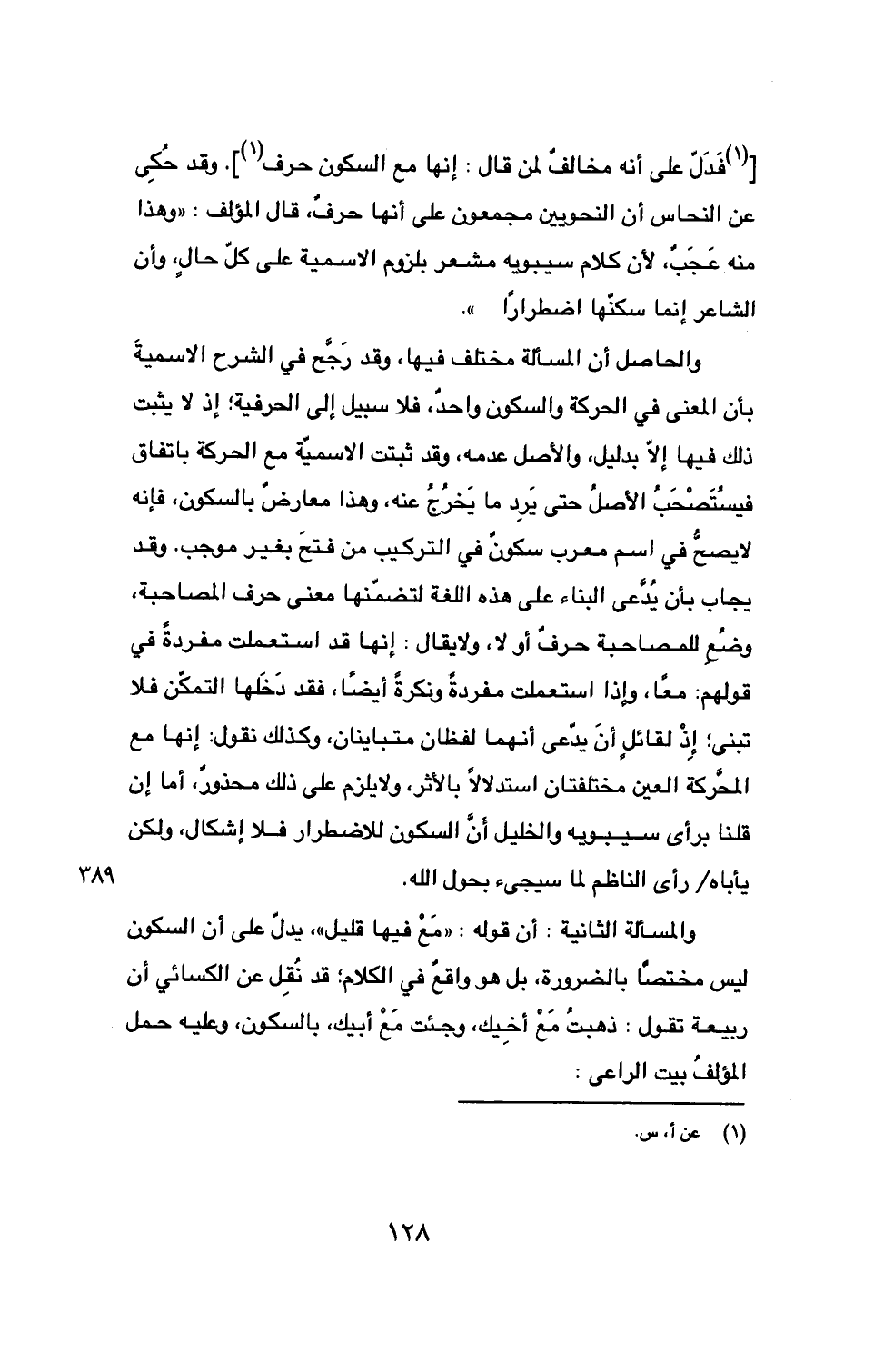 والحاصل أن المسألة مختلف فيها، وقد رَجَّح في الشرح الاسميةَ بأن المعنى في الحركة والسكون واحدٌ، فلا سبيل إلى الحرفية؛ إذ لا يثبت ذلك فيها إلاّ بدليل، والأصل عدمه، وقد ثبتت الاسميّة مع الحركة باتفاق فيسُتَصْحَبُ الأصلُ حتى يَرِد ما يَخرُجُ عنه، وهذا معارضٌ بالسكون، فإنه لا يصحُّ في اسم معرب سكونٌ في التركيب من فتحَ بغير موجب. وقد يجاب بأن يُدَّعى البناء على هذه اللغة لتضمّنها معنى حرف المصاحبة، وضُعِ للمصاحبة حرفٌ أو لا، ولا يقال: إنها قد استعملت مفردةً في قولهم: معاً، وإذا استعملت مفردةً ونكرةً أيضاً، فقد دَخَلها التمكّن فلا تبنى؛ إِذْ لقائلٍ أن يدّعي أنهما لفظان متباينان، وكذلك نقول: إنها مع المحَّركة العين مختلفتان استدلالاً بالأثر، ولا يلزم على ذلك محذورٌ، أما إن قلنا برأي سيبويه والخليل أَنَّ السكون للاضطرار فلا إشكال، ولكن يأباه/ رأي الناظم لما سيجئ بحول الله. ... 389