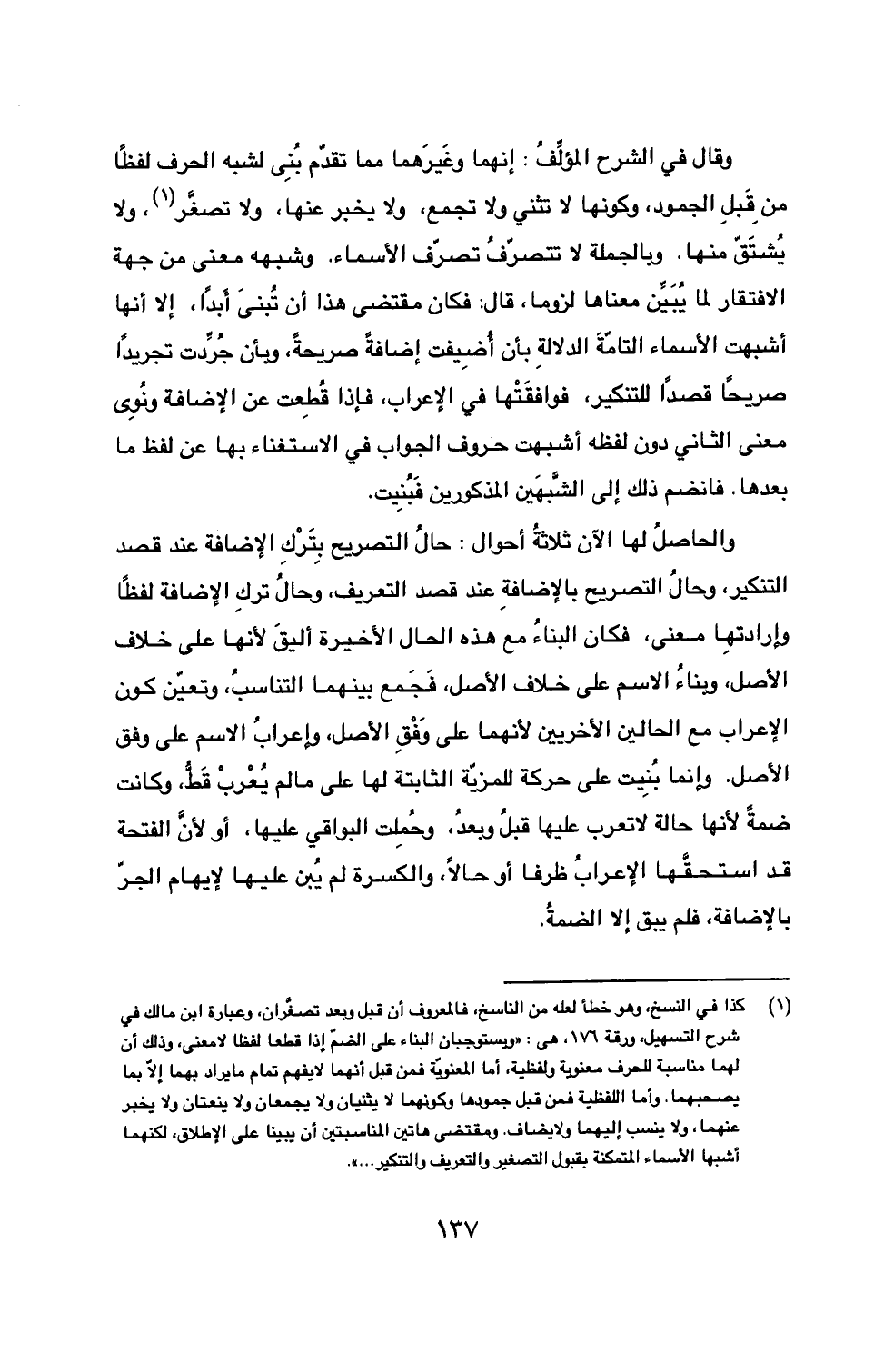 (1) كذا في النسخ، وهو خطأ لعله من الناسخ، فالمعروف أن قبل وبعد تصغَّران، وعبارة ابن مالك في شرح التسهيل، ورقة 176، هي: ((ويستوجبان البناء على الضمّ إذا قطعا لفظا لا معنى، وذلك أن لهما مناسبة للحرف معنوية ولفظية، أما المعنوية فمن قبل أنهما لا يفهم تماما ما يراد بهما إلا بما يصحبهما. وأما اللفظية فمن قبل جمودها وكونهما لا يثنيان ولا يجمعان ولا ينعتان ولا يخبر عنهما، ولا ينسب إليهما ولا يضاف. ومقتضى هاتين المناسبتين أن يبينا على الإطلاق، لكنهما أشبها الأسماء المتمكنة بقبول التصغير والتعريف والتنكير ... )).
