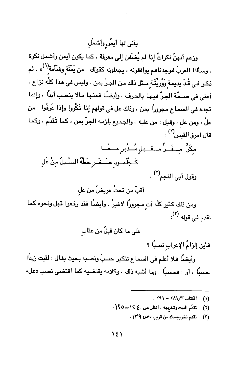 وزعم أنهنّ نكراتٌ إذا لم يُضفَن 'لى معرفة، كما يكون ايمن وأشمل نكرة. وسألنا العربَ فوجدناهم يوافقونه، يجعلونه كقولك: من يَمْنَةٍ وشَأْمةٍ (1))). ثم ذكر في قُدَ يديمةٍ وَوُريِّئَةٍ مثل ذلك من الجرّ بمن. وليس في هذا كلِّه نزاع، أعنى في صحّة الجرّ فيها بالحرف، وأيضاً فمنها مالا ينصب أبداً، وإنما تجده في السماع مجروراً بمن، وذلك عل في قولهم إذا نَكَّروا وإذا عَرفّوا: من علُ، ومن علِ، وقيل: من عليه، والجميع يلزمه الجرّ بمن، كما تَقدّم، وكما قال امرؤ القيس (2):
