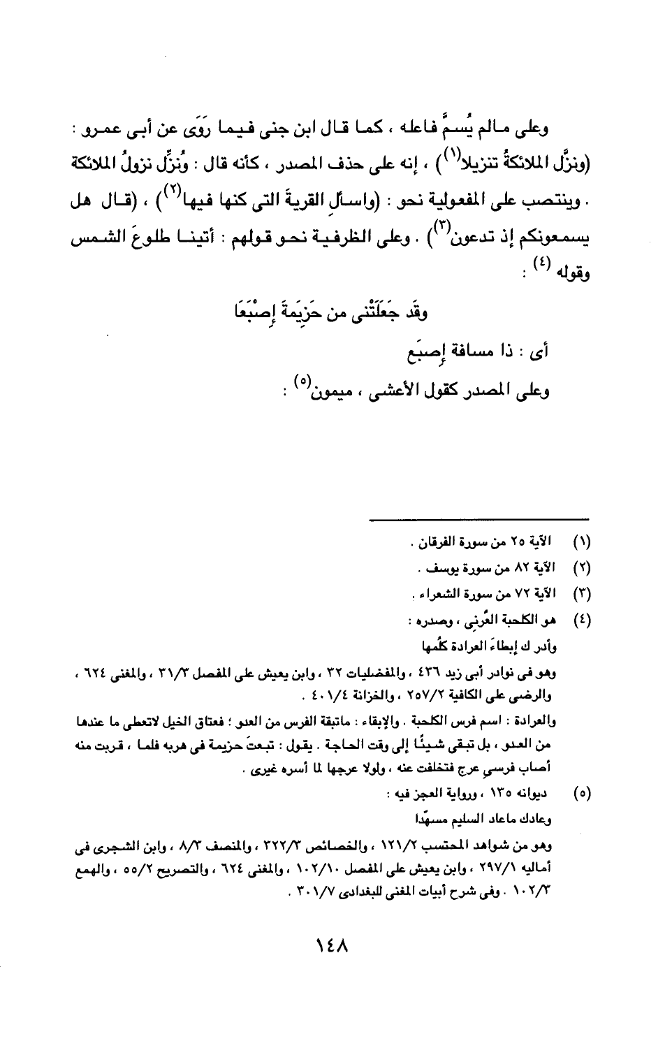 وعلى مالم يُسمَّ فاعله، كما قال ابن جني فيما رَوَى عن أبي عمرو: {ونزَّل الملائكةُ تنزيلا (1)، إنه على حذف المصدر، كأنه قال: ونُزِّل نزولُ الملائكة. وينتصب على المفعولية نحو: (واسأل القرية التي كنا فيها (2))، (قال هل يسمعونكم إذ تدعون (3). وعلى الظرفية نحو قولهم: أتينا طلوعَ الشمس وقوله (4):