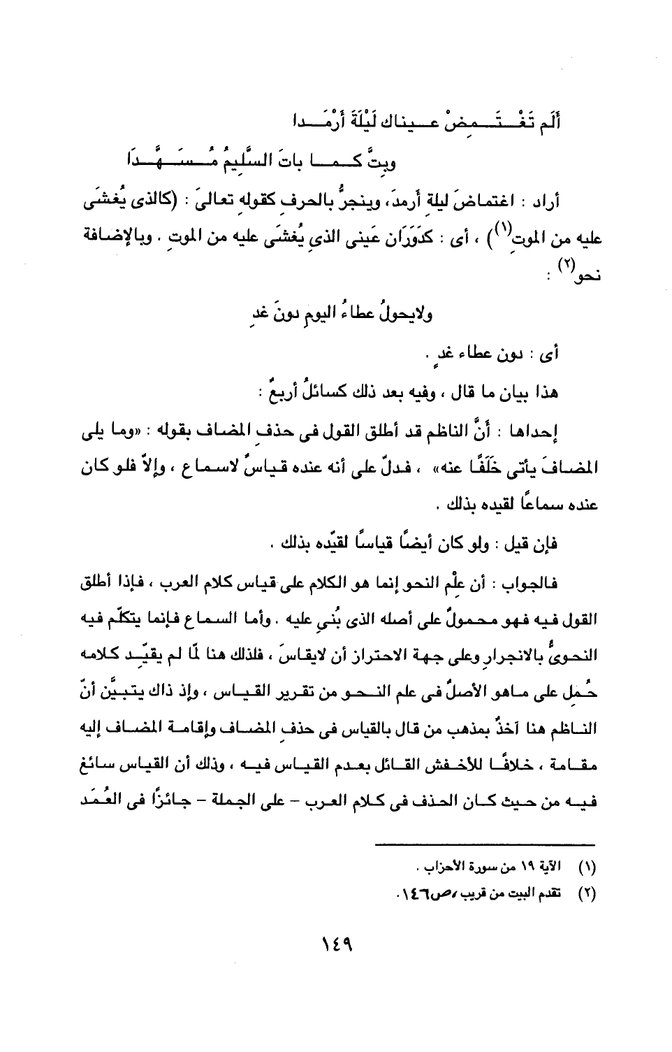 أراد: اغتماضَ ليلةِ أَرمدَ، وينجرُّ بالحرفِ كقولهِ تعالى: (كالذي يُغشَى عليه من الموتِ (1))، أي: كدوران عيني الذي يُغشى عليه من الموتِ. وبالإضافة نحو (2):