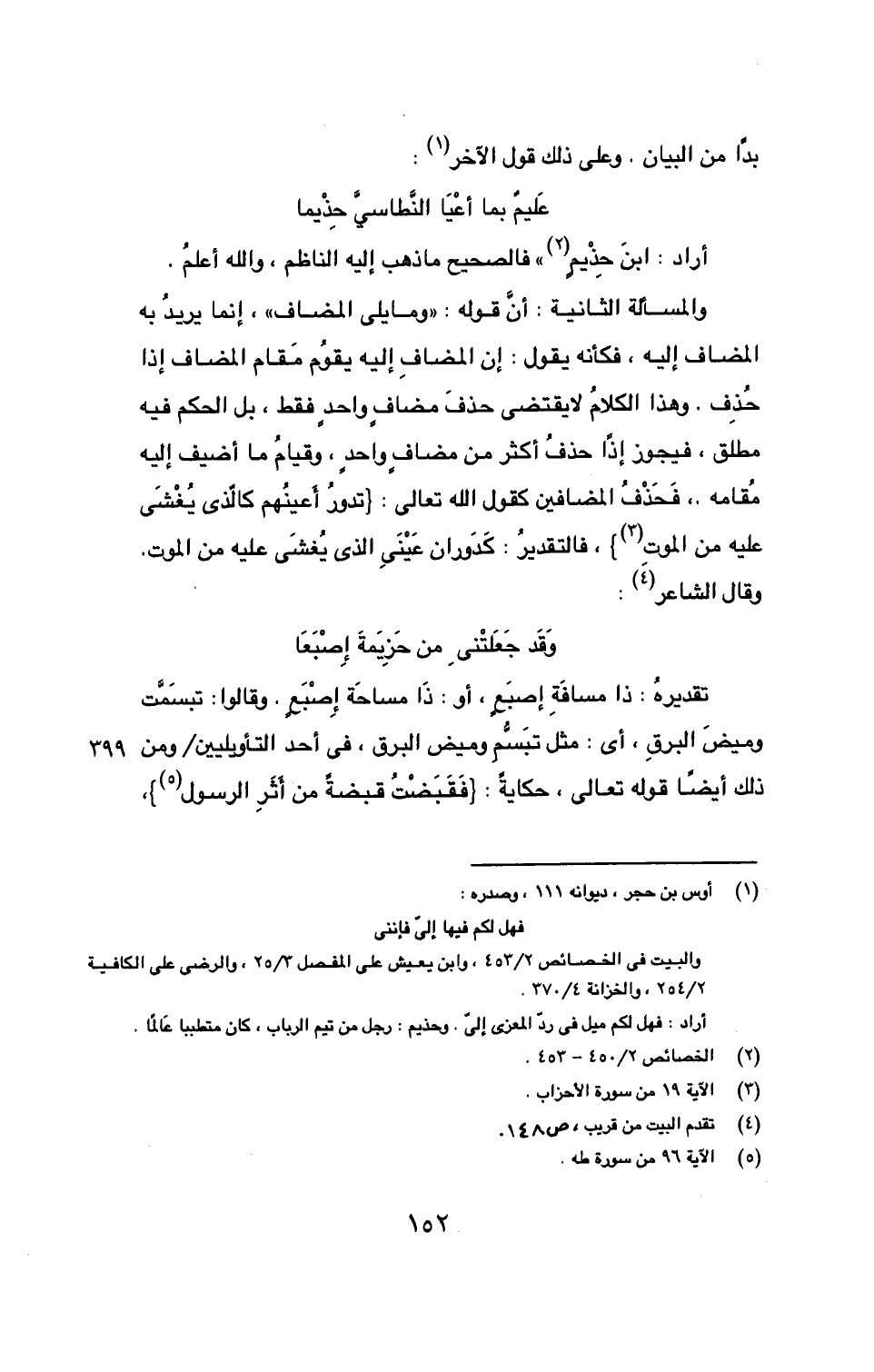 والمسألة الثانية: أنَّ قوله: ((وما يلي المضاف))، إنما يريدُ به المضاف إليه، فكأنه يقول: إن المضاف إليه يقومُ مقام المضاف إذا حُذِف. وهذا الكلامُ لا يقتضي خذفَ مضافٍ واحدٍ فقط، بل الحكم فيه مطلق، فيجوز إذاً حذفُ أكثر من مضافٍ واحدٍ، وقيامُ ما أضيف إليه مُقامه. فَحَذْفُ المضافين كقول الله تعالى: {تدورُ أَعينُهم كالّذي يُغْشَى عليه من الموتِ (3)}، فالتقديرُ: كَدَوران عَيْنَيِ الذي يُغشَى عليه من الموت. وقال الشاعر (4):