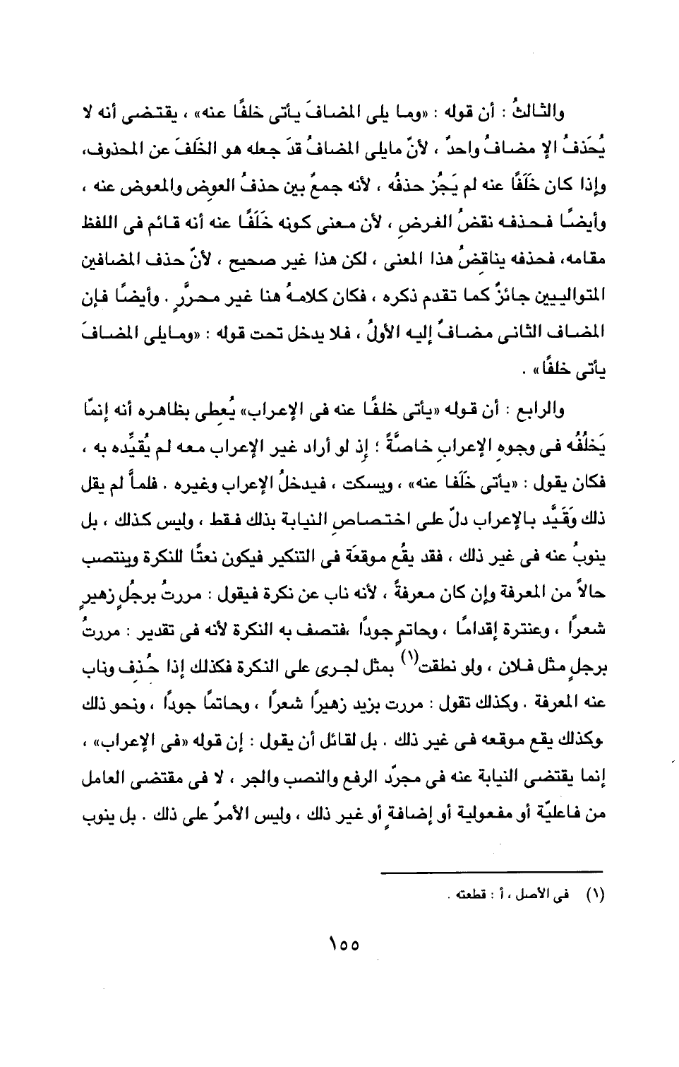 والثالثُ: أن قوله: ((وما يلي المضافَ يأتي خلفاً عنه))، يقتضي أنه لا يُحذفُ إلا مضاف واحد، لأن ما يلي المضافُ قد جعله هو الخلف عن المحذوف، وإذا كان خلفا عنه لم يجز حذفه، لأنه جمعٌ بين حذفُ العوِض والمعوض عنه، وايضاً فحذفه نقضُ الغرضِ، لأن معنى كونه خَلَفَاً عنه أنه قائم في اللفظ مقامه، فحذفه يناقِضُ هذا المعنى، لكن هذا غير صحيح، لأنّ حذف المضافين المتوالييين جائزٌ كما تقدم ذكره، فكان كلامهُ هنا غير محرَّرٍ. وأيضاً فإن المضاف الثاني مضافٌ إليه الأولُ، فلا يدخل تحت قوله: ((وما يلي المضافَ يأتي خلفاً)).