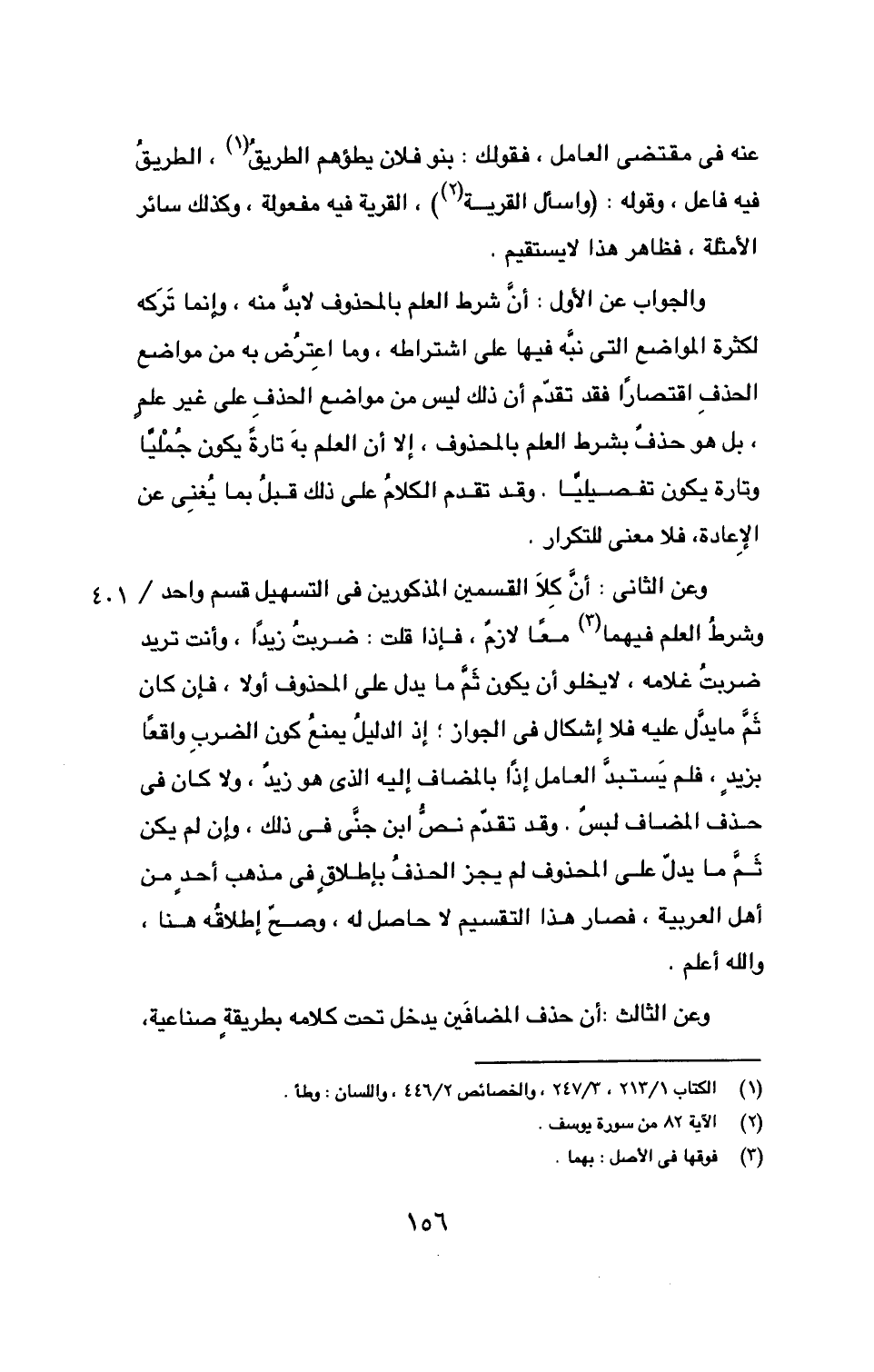 وعن الثالث: أن حذف المضافَين يدخل تحت كلامه بطريقةٍ صناعية،