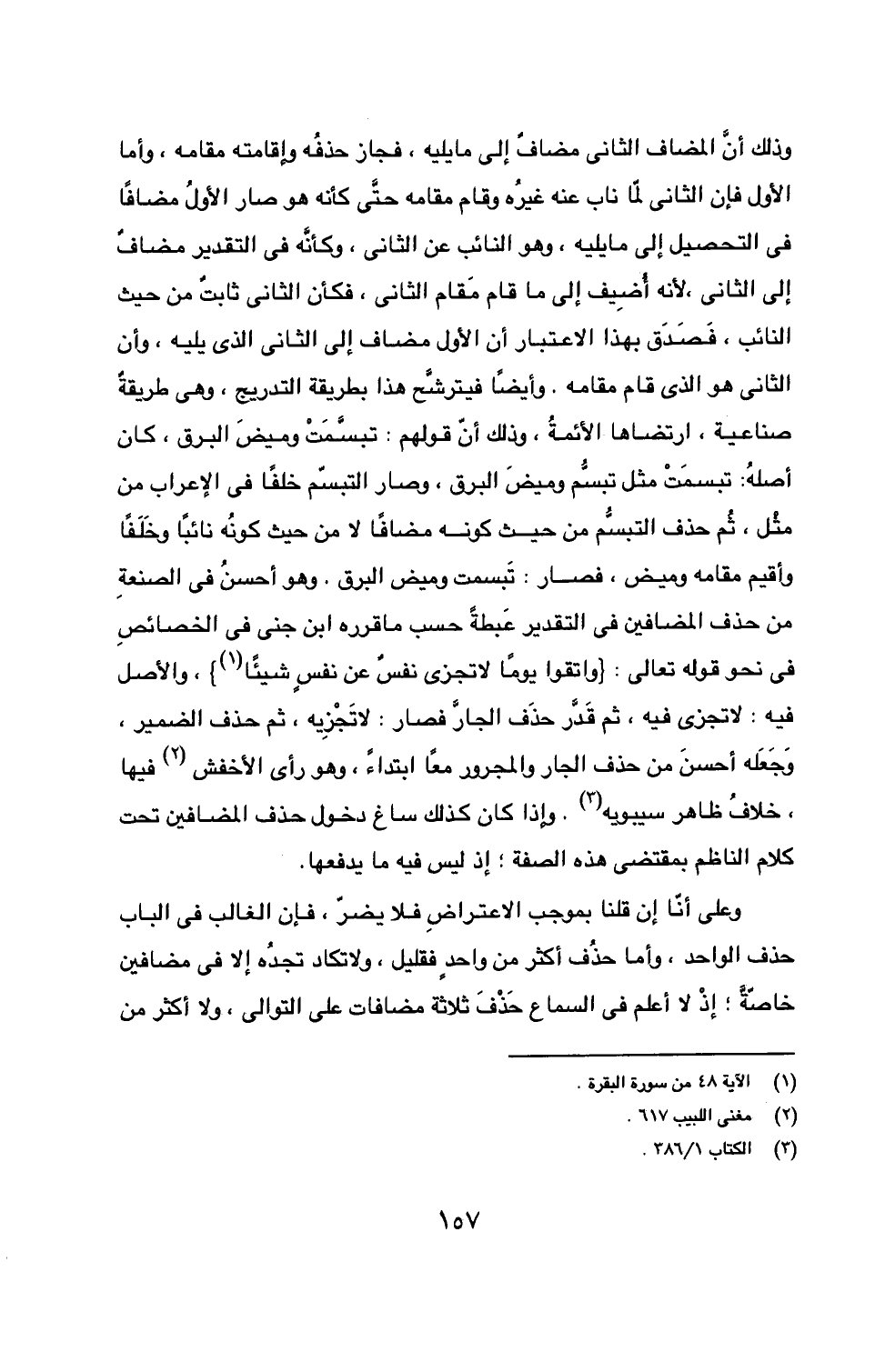 وذلك أن المضاف الثاني مضافٌ إلى ما يليه، فجاز حذفُه وإقامته مقامه، وأما الأول فإن الثاني لما ناب عنه غيرُه وقام مقامه حتى كأنه هو صار الأول مضافاً في التحصيل إلى ما يليه، وهو النائب عن الثاني، وكأنه في التقدير مضافٌ إلى الثاني، لأنه أُضيف إلى ما قام مقام الثاني، فكأن الثاني ثابتٌ من حيث النائب، فَصَدَق بهذا الاعتبار أن الأول مضاف إلى الثاني الذي يليه، وأن الثاني هو الذي قام مقامه. وأيضاً فيترشَّح ها بطريقة التدريج، وهي طريقةٌ صناعية، ارتضاها الأئمةُ، وذلك أنّ قولهم: تبسَّمَتْ وميضَ البرق، كان أصلهُ: تبسمَتْ مثل تبسُّم وميضَ البرق، وصار التبسّم خلفاً في الإعراب من مثْل، ثُم حذف التبسُّم من حيث كونه مضافاً لا من حيث كونُه نائباً وخلفاً وأقيم مقامه وميض، فصار: تَبسمت وميض البرق. وهو أحسنُ في الصنعةِ من حذف المضافين في التقدير عَبطةً حسب ما قرره ابن جني في الخصائصِ في نحو قوله تعالى: {واتقوا يوماً لا تجزي نفسٌ عن نفسٍ شيئاً (1)}، والأصل فيه: لا تجزي فيه، ثم قَدَّر حذف الجارَّ فصار: لا تَجْزِيه، ثم حذف الضمير، وَجَعَله أحسنَ من حذف الجار والمجرور معاً ابتداءً، وهو رأي الأخفش (2) فيها، خلافُ ظاهر سيبويه (3). وإذا كان كذلك ساغ دخول حذف المضافين تحت كلام الناظم بمقتضى هذه الصفة؛ إذ ليس فيها ما يدفعها.