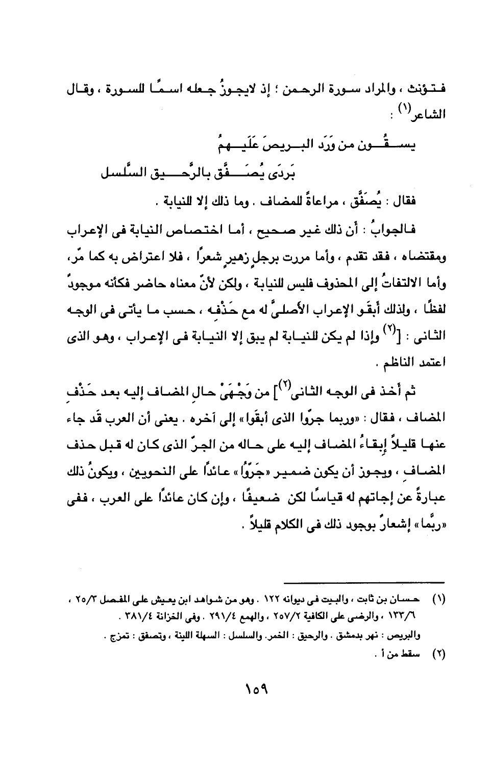 (1) حسان بن ثابت، والبيت في ديوانه 122، وهو من شواهد ابن يعيش على المفصل 3/ 25، 6/ 133، والرضى على الكافية 2/ 257، والهمع 4/ 291. وفي الخزانة 4/ 381.