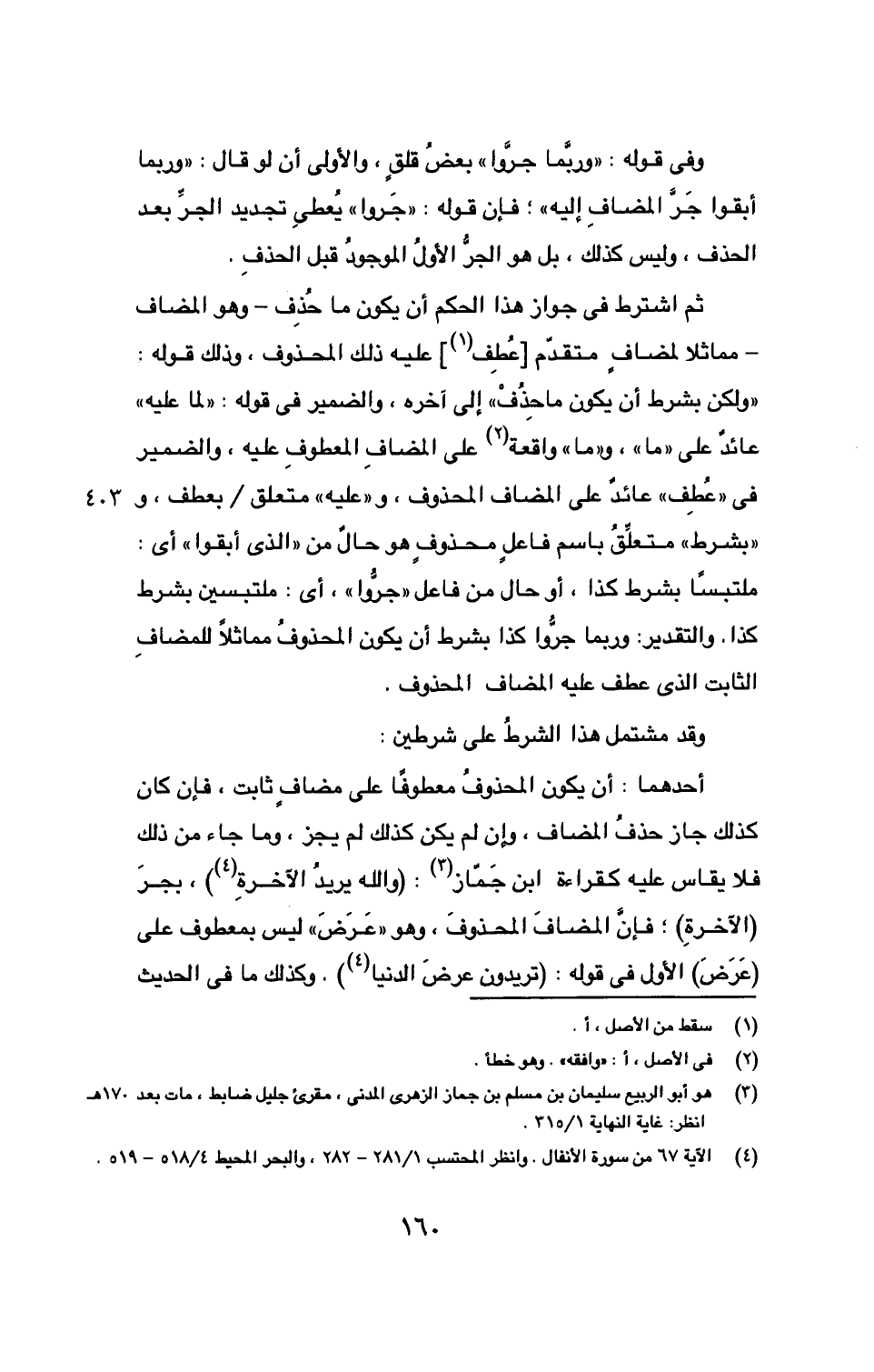 أحدهما: أن يكون المحذوفُ معطوفاً على مضافٍ ثابتٍ، فإن كان كذلك جاز حذفُ المضاف، وإن لم يكن كذلك لم يجز، وما جاء من ذلك فلا يقاس عليه كقراءة ابن جَمّاز (3): (والله يريدُ الآخرةِ (4)))، بجرَ (الآخرةِ)؛ فإن المضافَ المحذوفَ، وهو ((عَرَضَ)) ليس بمعطوف على (عَرَضَ) الأول في قوله: (تريدون عرضَ الدنيا (4)). وكذلك ما في الحديث