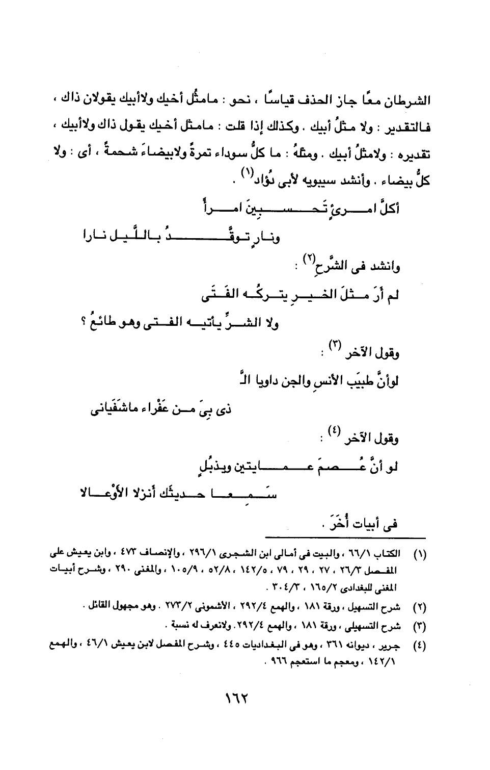 الشرطان معاً جاز الحذف قياساً، نحو: ما مثُل أخيك ولا أبيك يقولان ذاك، فالتقدير: ولا مثلُ أبيك. وكذلك إذا قلت: ما مثل أخيك يقول ذاك زلا أبيك، تقديره: ولا مثلُ أبيك. ومثلهُ: ما كلُّ سوداء تمرةً ولا بيضاءَ شحمةً، أي: ولا كلُّ بيضاء. وأنشد سيبويه لأبي دُؤاد (1).