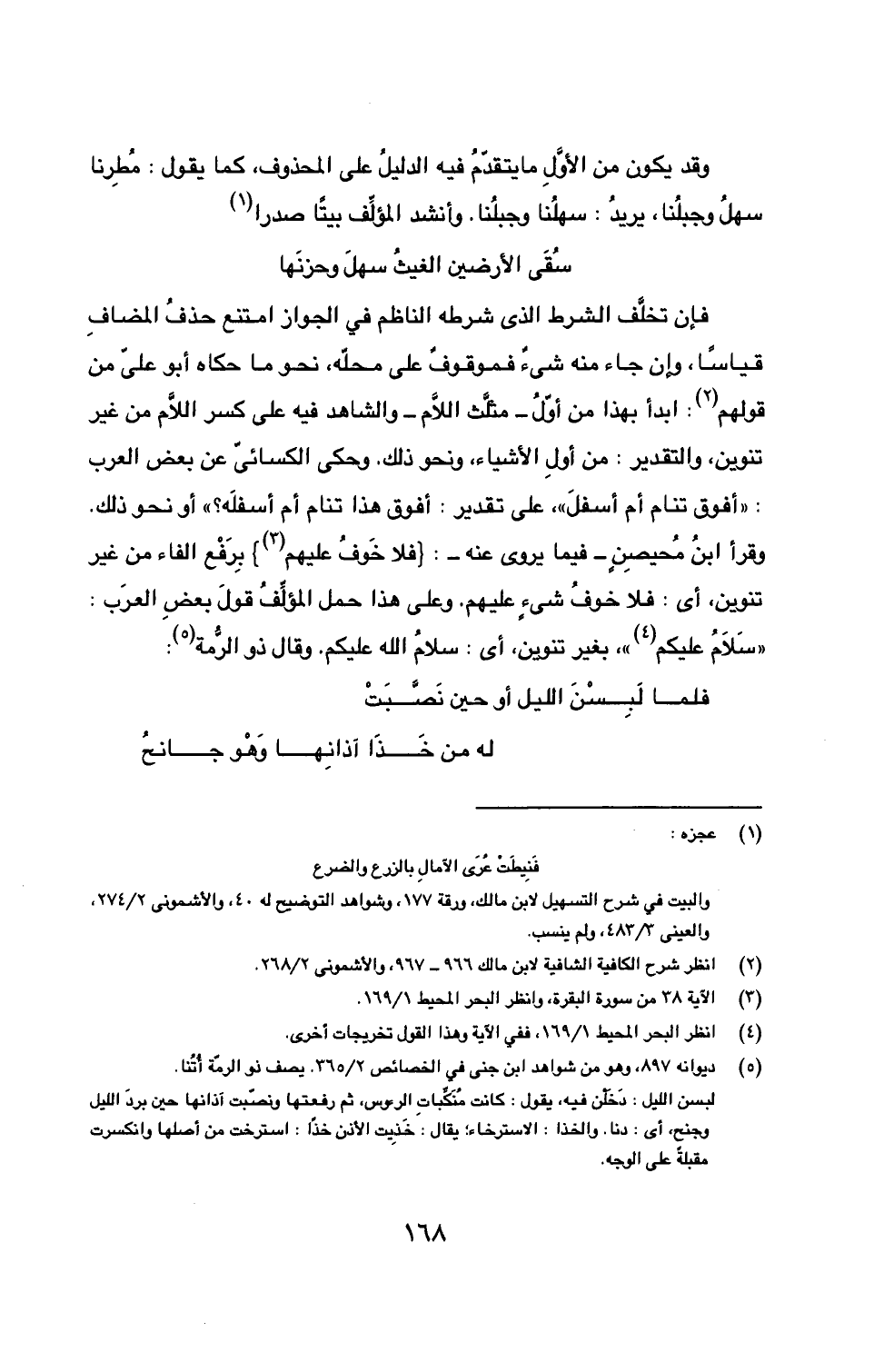 فإن تخلَّف الشرط الذي شرطه الناظم في الجواز امتنع حذفُ المضافِ قياساً، وإن جاء منه شيءٌ فموقوفٌ على محلّه، نحو ما حكاه أبو علىّ من قولهم (2): ابدأ بهذا من أوّلُ-مثلَّث اللاَّم-والشاهد فيه كسر اللاَّم من غير تنوين، والتقدير: من أولِ الأشياء، ونحو ذلك. وحكى الكسائيّ عن بعض العرب: ((افوق تنام أم أسفلَ))، على تقدير: أفوق هذا تنام أو أسفلَه؟ )) أو نحو ذلك. وقرأ ابنُ مُحيصِنٍ-فيما يروى عته-: {فلا خَوفُ عليهن (3)} بِرَفْع الفاء من غير تنوين، أي: فلا خوفُ شيءٍ عليهم. وعلى هذا حمل المؤلِّفُ قولَ بعضِ العرَب: ((سَلاَمُ عليكم (4)))، بغير تنوين، أي: سلامُ الله عليكم. وقال ذو الرُّمة (5):