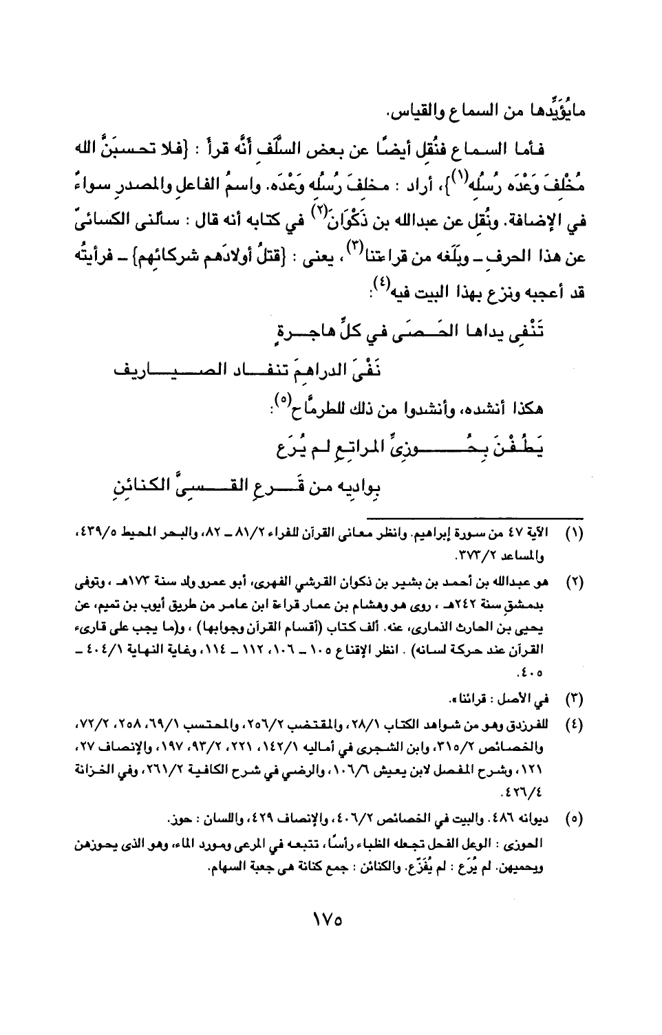 فأما السماع فنُقِل أيضاً عن بعض السلَّفِ أَنَّه قرأ: {فلا تحسبَنَّ الله مُخْلِفَ وَعْدَه رُسُلِه (1)}، أراد: مخلِفَ رٌسٌلِه وَعْدَه. واسمُ الفاعلِ والمصدر سواءٌ في الإضافة. ونُقل عن عبدالله بن ذَكْوَانَ (2) في كتابه أنه قال: سألني الكسائيّ عن هذا الحرفِ-وبَلَغه من قراءتنا (3)، يعني: {قتلُ أولادَهم شركائِهم} - فرأيتُه قد أعجبه ونزع بهذا البيت فيه (4):