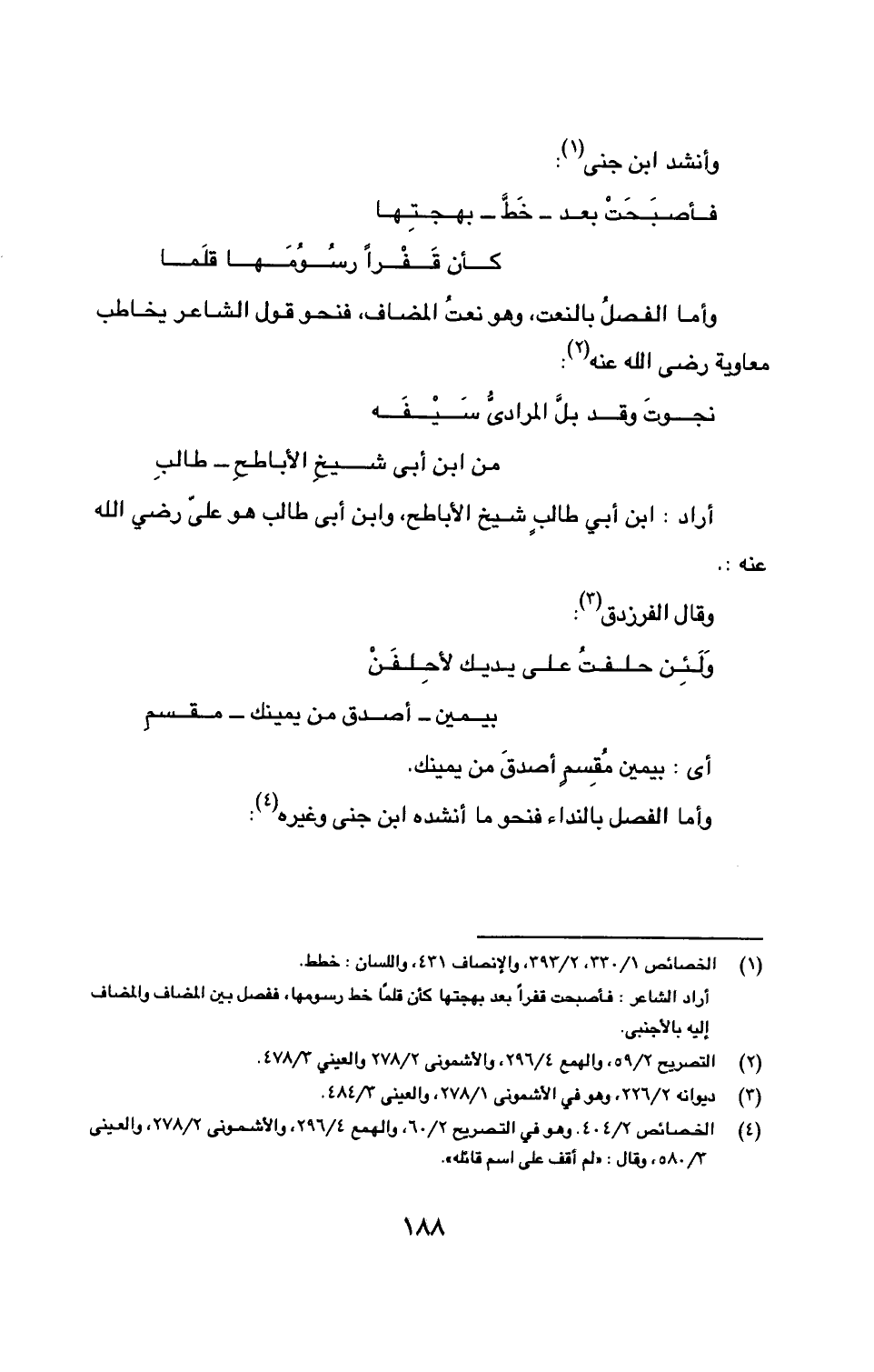 (4) الخصائص 2/ 404. وهو في التصريح 2/ 60، والهمع 4/ 296، والأشموني 2/ 278، والعيني 3/ 80، وقال: ((لم أقف على اسم قائله)).