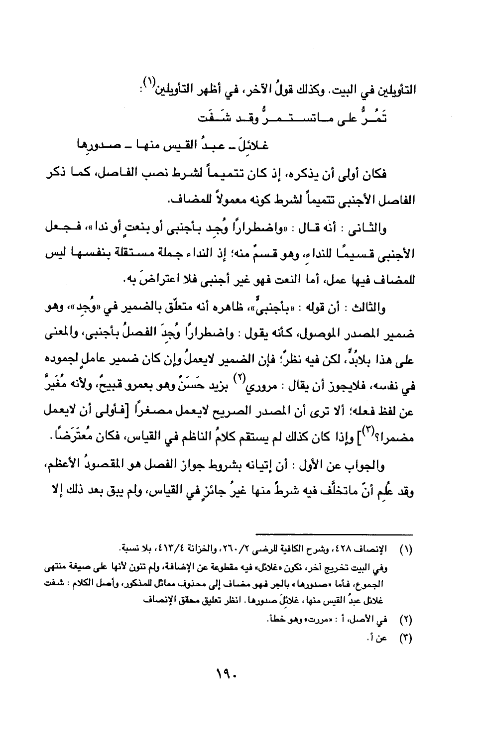 والثالث: أن قوله: ((بأجنبيٍّ))، ظاهره أنه متعلق بالضمير في ((وُجِد))، وهو ضمير المصدر الموصول، كأنه يقول: واضطراراً وُجِدَ الفصلُ بأجنبي، والمعنى على هذا بلابُدٍّ، لكن فيه نظرٌ؛ فإن الضمير لا يعملُ وإن كان ضمير عاملٍ لجموده في نفسه، فلا يجوز أن يقال: مروري (2) بزيد حَسَنٌ وهو بعمر قبيحٌ، ولأنه مُغَيرَّ عن لفظ فعله؛ ألا ترى أن المصدر الصريح لا يعمل مصغراً [فأولى أن لا يعمل مضمرا؟ (3)] وإذا كان كذلك لم يستقم كلامُ الناظم في القياس، فكان مُعتَرَضاً.