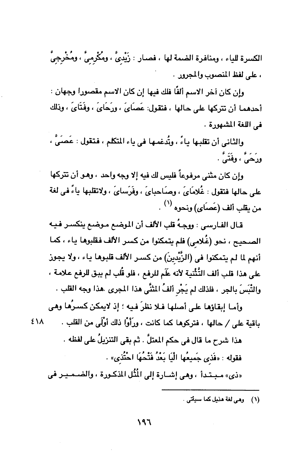 وإن كان مثنى مرفوعاً فليس لك فيه إلا وجه واحد، وهو أن تتركها على حالها فتقول: غُلامَاىَ، وصًاحباىَ، وفَرَساىَ، ولا تقلبها ياء في لغة من يقلب ألف (عَصَاى) ونحوه (1).