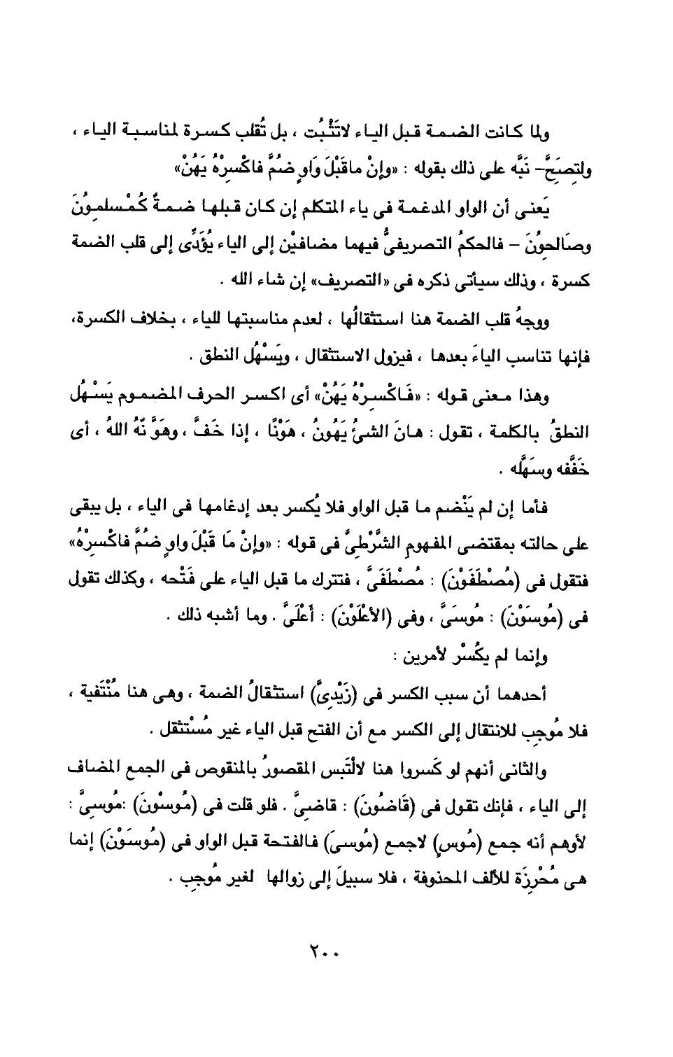 والثاني أنهم لو كَسروا هنا لالْتَبس المقصورُ بالمنقوص في الجمع المضاف إلى الياء، فإنك تقول في (قَاضُونَ): قاضِىَّ. فلو قلت في (مُوسْونَ): مُوسِىَّ: لأوهم أنه جمع (مُوسٍ) لا جمع (مُوسىَ) فالفتحة قبل الواو في (مُوسَوْنَ) إنما هي مُحْرِزَة للألف المحذوفة، فلا سبيلَ إلى زوالها لغير مُوجِب.
