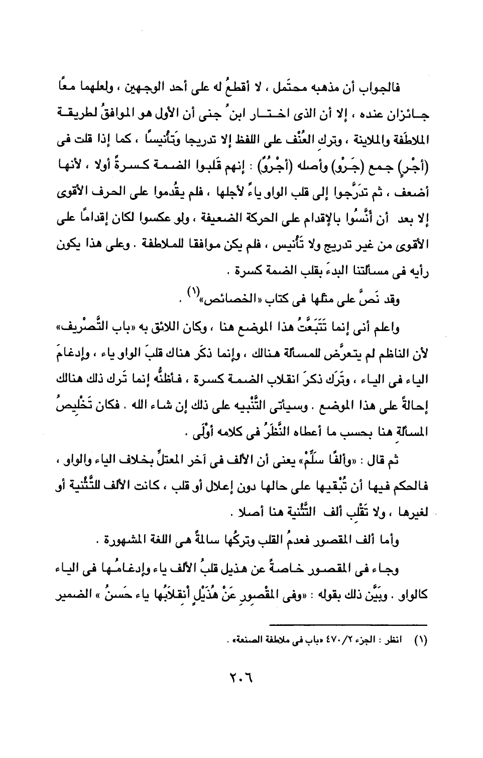 فالجواب أن مذهبه محتَمل، لا أقطعُ له على أحد الوجهين، ولعلهما معاً جائزان عنده، إلا أن الذي ختار ابنُ جني أن الأول هو الموافقُ لطريقة الملاطَفة والملاينة، وترِك العُنْف على اللفظ إلا تدريجا وَتأْنيساً، كما إذا قلت في (أجْرٍ) جمع (جَرْو) وأصله (أجْرُوٌ): إنهم قلبوا الضمة كسرةً أولا، لأنها أضعف، ثم تدَرَّجوا إلى قلب الواو ياءً لأجلها، فلم يقُدموا على الحرف الأقوى إلا بعد أن أَنَّسُوا بالإقدام على الحركة الضعيفة، ولو عكسوا لكان إقداماً على الأقوى من غير تدريج ولا تَأْنيس، فلم يكن موافقا للملاطفة. وعلى هذا يكون رأيه في مسألتنا البدءَ بقلب الضمة كسرة.