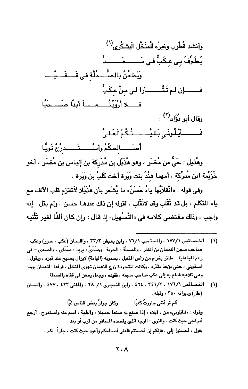 (1) الخصائص 1/ 177، والمحتسب 1/ 76، وابن يعيش 3/ 33، واللسان (عكب، حرر) وعكب: صاحب سجن النعمان بن المنذر. والصملَّة: الحربة. وصَدَىَّ: يريد صَدَاى. والصدى- في زعم الجاهلية- طائر يخرج من رأس القتيل، يسمونه (الهامة) لا يزال يصيح عند قبره، ويقول: اسقوني، حتة يؤخذ بثأره. وكانت المتجردة زوج النعمان تهوى المنخل، فرآها النعمان يوما وهي تلاعبه فدفع به إلى عكب صاحب سجنه، فقيده، وجعل يطعن في قفاه بالصملة.