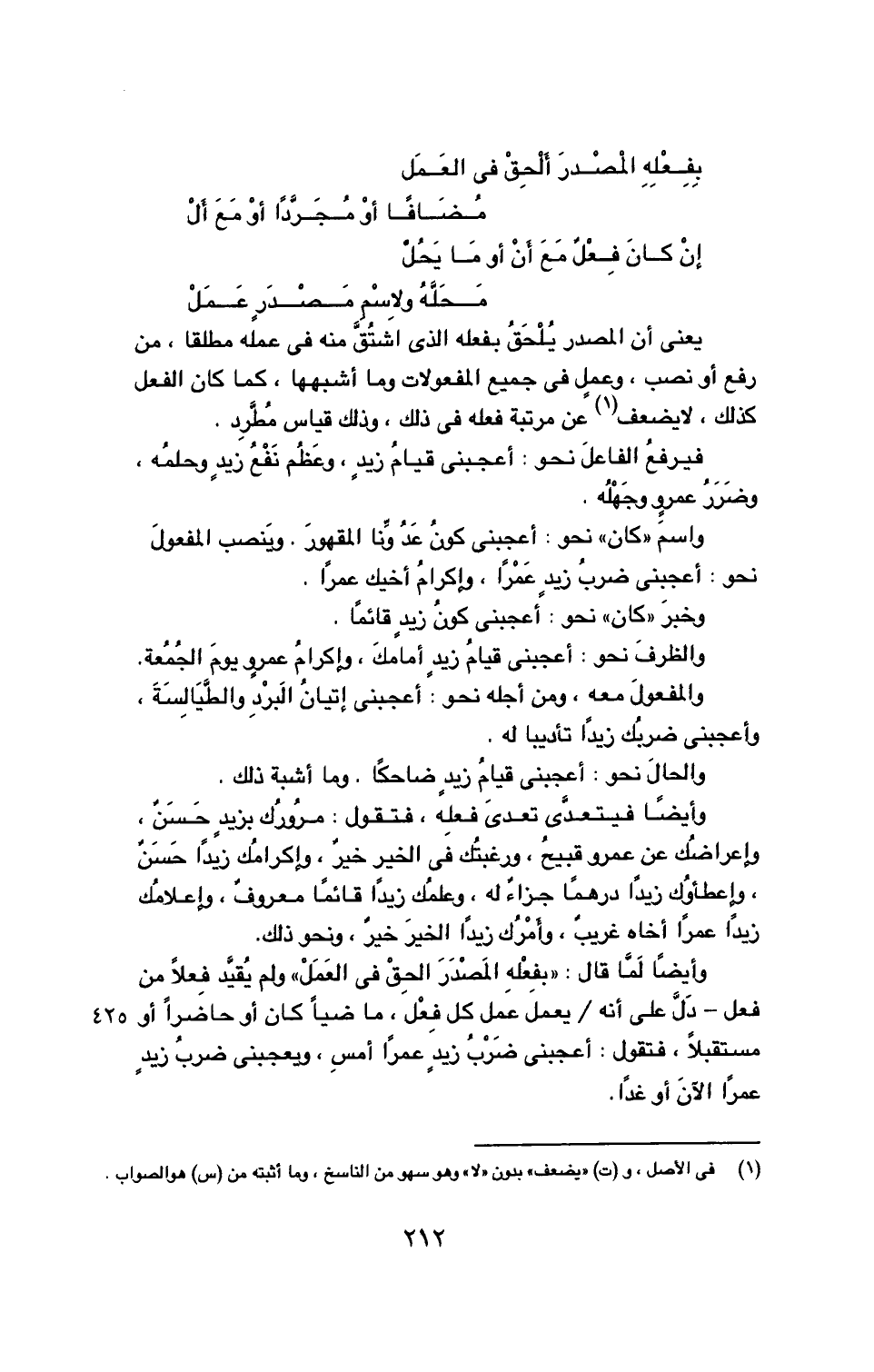 وأيضاً لًمَّا قال: ((بفِعْلهِ المَصْدَرَ الحِقْ في العَمَلْ)) ولم يُقيَّد فعلاً من فعل - دَلَّ على أنه ... / يعمل عمل كل فِعْل، ماضياً كان أو حاضراً أو مستقبلاً، فتقول: أعجبني ضَرْبُ زيدٍ 425 عمراً أمسِ، ويعجبني ضربُ زيدٍ عمراً الآنَ أو غداً.