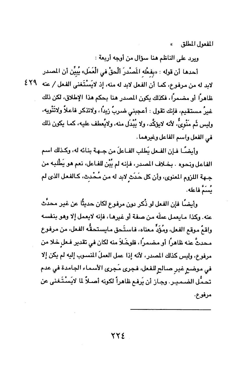 أحدها أن قوله: ((بِفِعْلِه المَصْدرَ ألْحقْ في الْعَمَل)) يُبِيِّن أن المصدر لابد له من مرفوع، كما أن الفعل لابد له منه، إذ لا يَسْتَغنى الفعل/ عنه ظاهراً أو مضمراً، فكذلك يكون ... 429 المصدر هنا بحكم هذا الإطلاق، لكن ذلك غيرُ مستقيم، فإنك تقول: أعجبني ضربً زيداً، ولا تذكر فاعلاً ولا تَنْويه، وليس تَم مَنْوِيٌّ، لأنه لا يؤكَّد، ولا يُبْدَل منه، ولا يُعطف عليه، كما يكون ذلك في الفعل واسم الفاعل وغيرها.