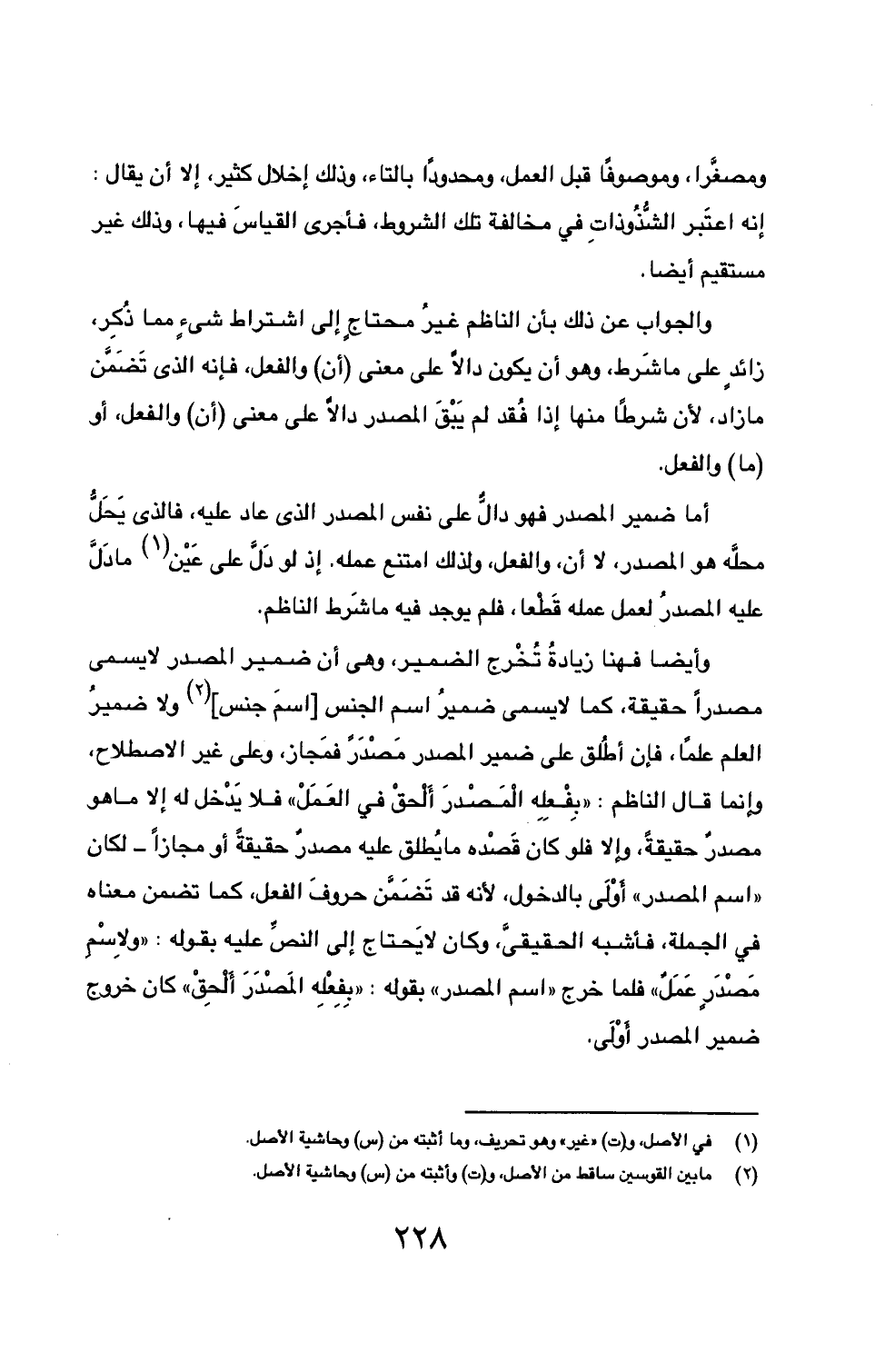 وأيضا فهنا زيادةُ تُخْرج الضمير، وهي أن ضمير المصدر لا يسمى مصدراً حقيقة، كما لا يسمى ضميرُ اسم الجنس [اسمَ جنس] (2) ولا ضميرُ العلم علماً، فإن أطُلق على ضمير المصدر مَصْدَرً فمَجاز، وعلى غير الاصطلاح، وإنما قال الناظم: ((بِفْعِلِه الْمَصْدرَ أَلْحقْ في العَمَلْ)) فلا يَدْخل له إلا ما هو مصدرٌ حقيقةً، وإلا فلو كان قَصْده ما يُطلق عليه مصدرُ حقيقةً أو مجازاً- لكان ((اسم المصدر)) أَوْلَى بالدخول، لأنه قد تَضَمَّن حروفَ الفعل، كما تضمن معناه في الجملة، فأشبه الحقيقيَّ، وكان لا يَحتاج إلى النصِّ عليه بقوله: ((ولاِسْمِ مَصْدَرٍ عَمَلٌ)) فلما خرج ((اسم المصدر)) بقوله: ((بِفِعْلِه المَصْدَرَ أَلْحِقْ)) كان خروج ضمير المصدر أَوْلَى.