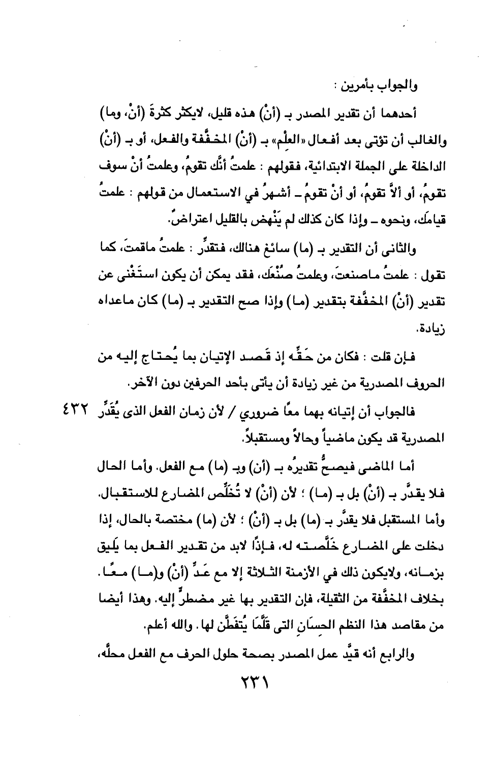 فالجواب أن إتيانه بهما معاً ضروري/ لأن زمان الفعل الذي يُقَدِّر المصدرية قد يكون ... 432 ماضياً وحالاً ومستقبلاً.