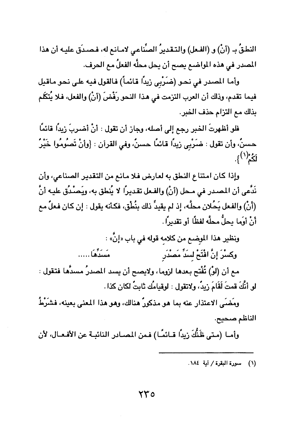 فلو أظهرت الخبر رجع إلى أصله، وجاز أن تقول: أنْ أضربَ زيداً قائماً حسنٌ، وأن تقول: ضَرْبِي زيداً قائماً حسنٌ، وفي القرآن: {وأنْ تَصُومُوا خَيْرٌ لَكُمْ (1)}.
