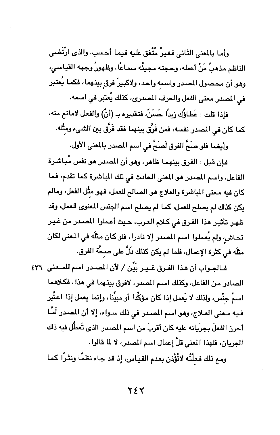 فالجواب أن هذا الفرق غير بَيِّن / لأن المصدر اسم للمعنى الصادر من الفاعل، 436 وكذلك اسم المصدر، لا فرق بينهما في هذا، فكلاهما اسمُ جِنْس، ولذلك لا يَعمل إذا كان مؤكِّدا أو مبيِّنا، وإنما يعمل إذا اعتُبر فيه معنى العلاج، وهو اسم المصدر في ذلك سواء، إلا أن المصدر لَمَّا أحرز الفعلَ بجرَيانه عليه كان أقربَ من اسم المصدر الذي تَعطَّل فيه ذلك الجريان، فلهذا المعنى قلَّ إعمال اسم المصدر، لا لما قالوا.