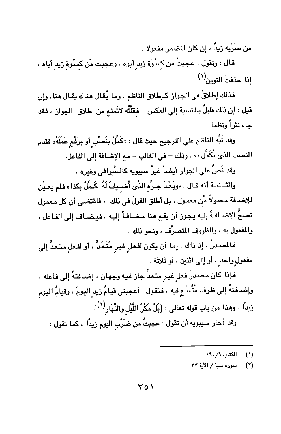 فإذا كان مصدرَ فعلٍ غيرِ متعدٍّ جاز فيه وجهان، إضافتهُ إلى فاعله، وإضافتهُ إلى ظرف مُتَّسَعٍ فيه، فتقول: أعجبني قيامُ زيدٍ اليومَ، وقيامُ اليومِ زيداً. وهذا من باب قوله تعالى: {بَلْ مَكْرُ اللَّيْلِ والنَّهَارِ (2)}