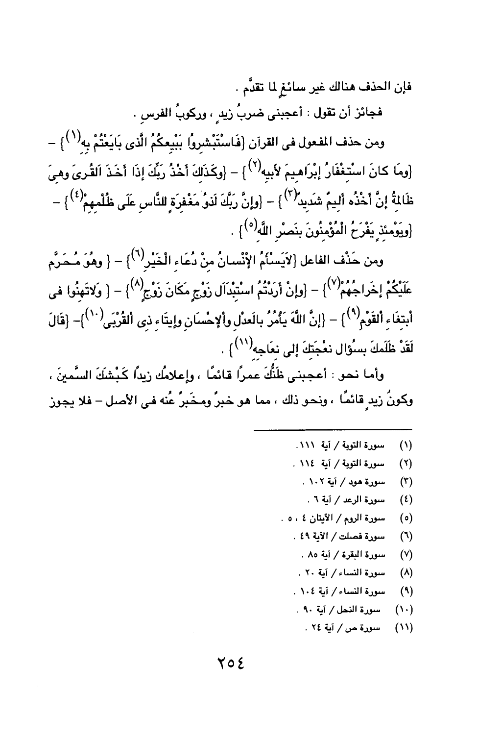 ومن حَذْف الفاعل {لاَ يَسْأَمُ الإْنْسانُ مِنْ دُعَاءِ الْخَيْرِ (6)} - {وهُوَ مُحَرَّم عَلَيْكُمْ إخَراجُهُمْ (7)} - {وإِنْ أَرَدْتُمُ اسْتِبْدَاَل زَوْجٍ مَكَانَ زَوْجٍ (8)} - {وَلا تَهِنُوا في ابتِغَاءِ الْقَوْمِ (9)} - {إنَّ اللهَ يَأمُرُ بالَعدْلِ والإحْسَانِ وإيتَاءِ ذِي القُرْبَى (10)} - {قَالَ لَقَدْ ظَلَمكَ بسُؤال نعْجَتِكَ إلى نِعَاجِهِ (11)}.