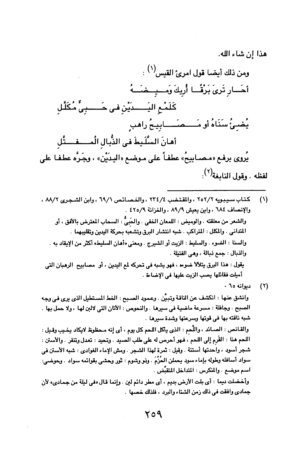 (2) ديوانه 65. وانشق عنها: انكشف عن الناقة وتبيَّن. وعمود الصبح: الخط المستطيل الذي يرى في وجه الصبح. وجافلة: مسرعة ماضية في سيرها. والنحوص: الأتان التي لا لبن لها، ولا حمل بها. شبه ناقته بها في قوتها وسرعتها وشدة سيرها. والقانص: الصائد، واللَّحِم: الذي يأكل اللحم كل يوم، أي أنه محظوظ لا يكاد يخيب وقيل: اللحم هنا: القَرِم إلى اللحم، فهو أحرص له على طلب الصيد. وتحيد: تعدل وتنفر. والأستن: شجر أسود، واحدتها أستنة. وقيل: ثمرة لهذا الشجر. ومش الإماء الغوادي: شبه الأستن في سواد أسافله وطوله بإماء صود يحمان الحُزُمَ. وذو وشوم: ثور وحشي بقوائمه سواد. وحوضي: اسم موضع. والمنكرس: المتداخل المتقبَّض. وأخضلت ديما: أي بلت الأرض بديم، أي مطر دائم لين. وإنما قال ((في ليلة من جمادى، لأن جمادى وافقت في ذلك زمن الشتاء والبرد، فلذلك خصها.