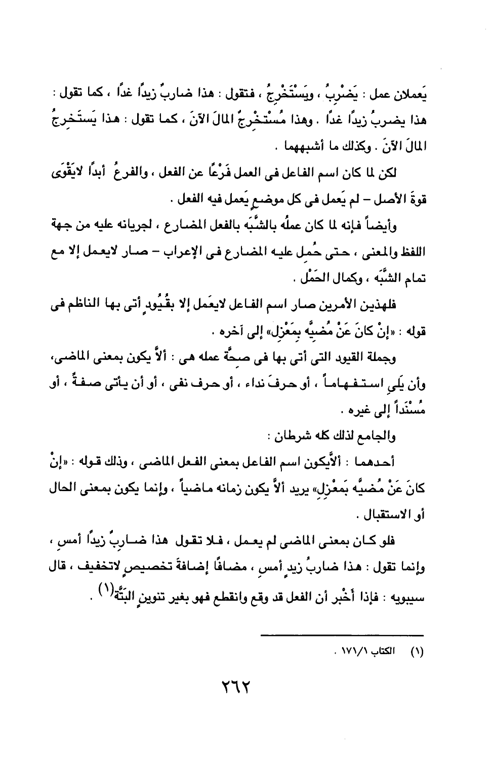 أحدهما: إلاَّ يكون اسم الفاعل بمعنى الفعل الماضي، وذلك قوله: ((إنْ كانَ عَنْ مُضيَّه بَمعْزِلِ)) يريد ألاَّ يكون زمانه ماضياً، وإنما يكون بمعنى الحال أو الاستقبال.