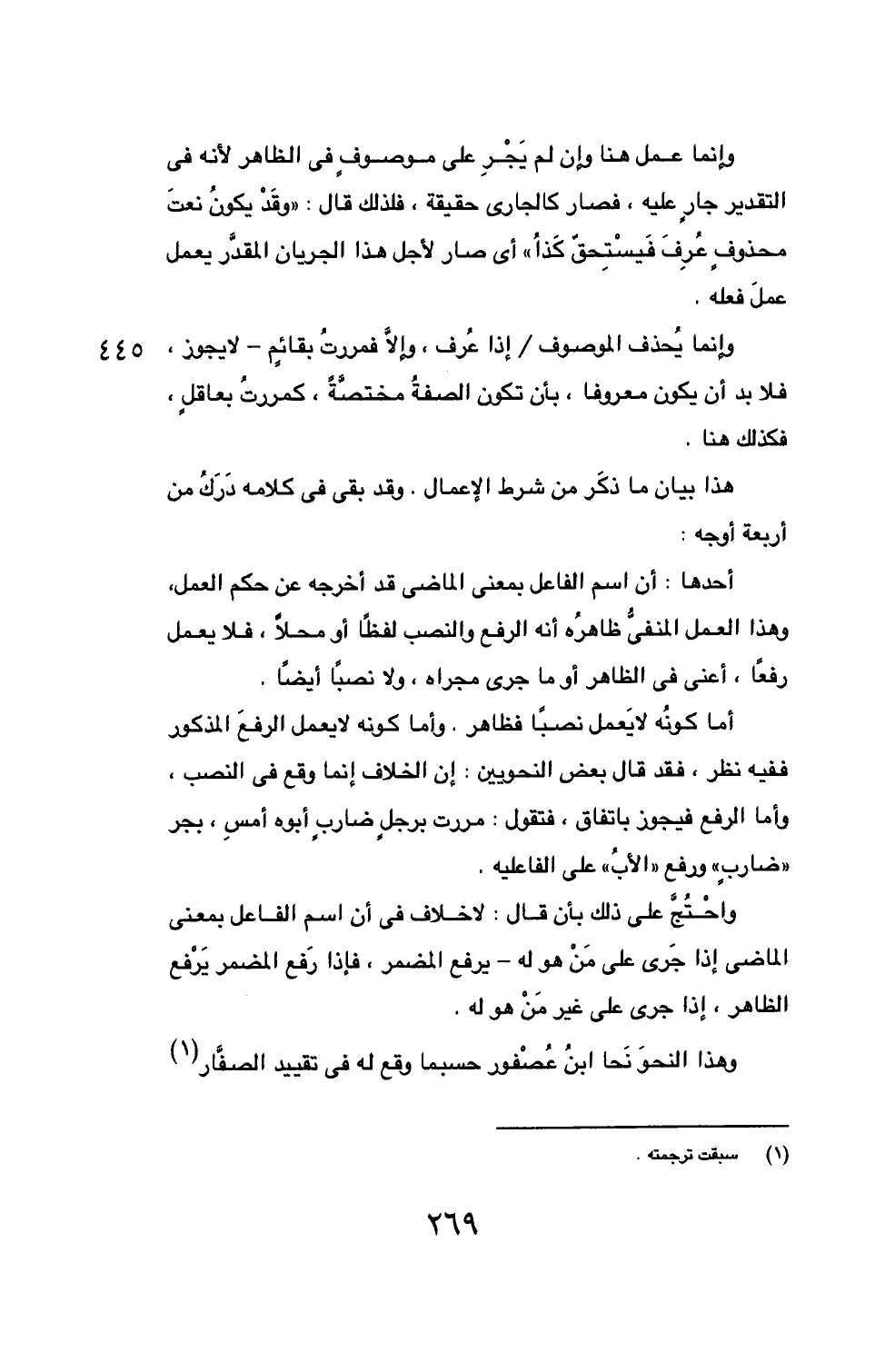 أحدها: أن اسم الفاعل بمعنى الماضي قد أخرجه عن حكم العمل، وهذا العمل المنفيُّ أنه الرفع والنصب لفظاً أو محلاً، فلا يعمل رفعاً، أعني في الظاهر أو ما جرى مجراه، ولا نصباً أيضاً.